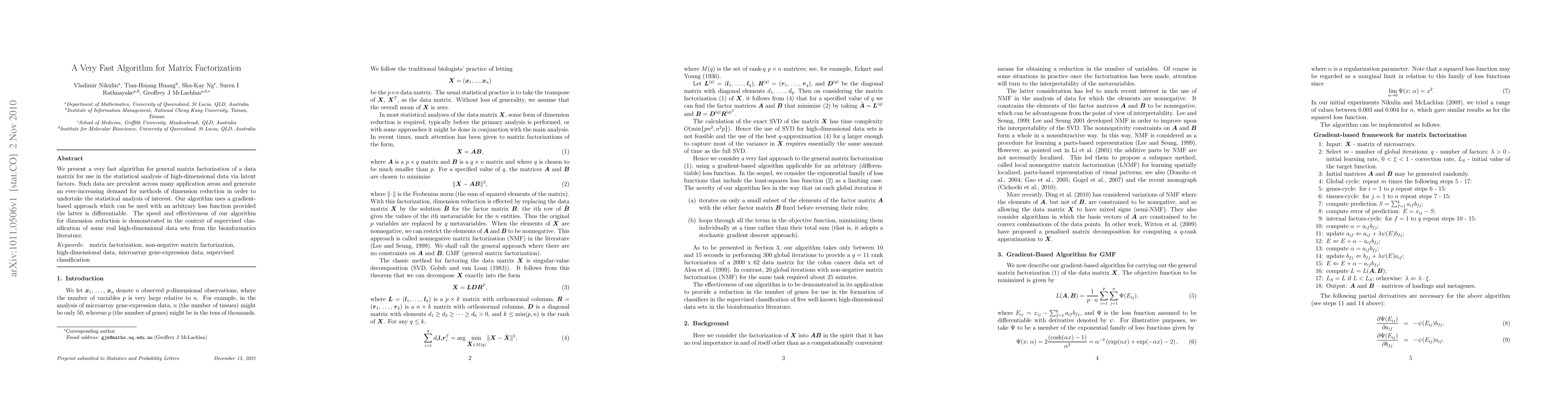A fast algorithm for matrix factorization is presented to reduce high-dimensional data, improving statistical analysis capabilities, with demonstrated effectiveness on real bioinformatics datasets.