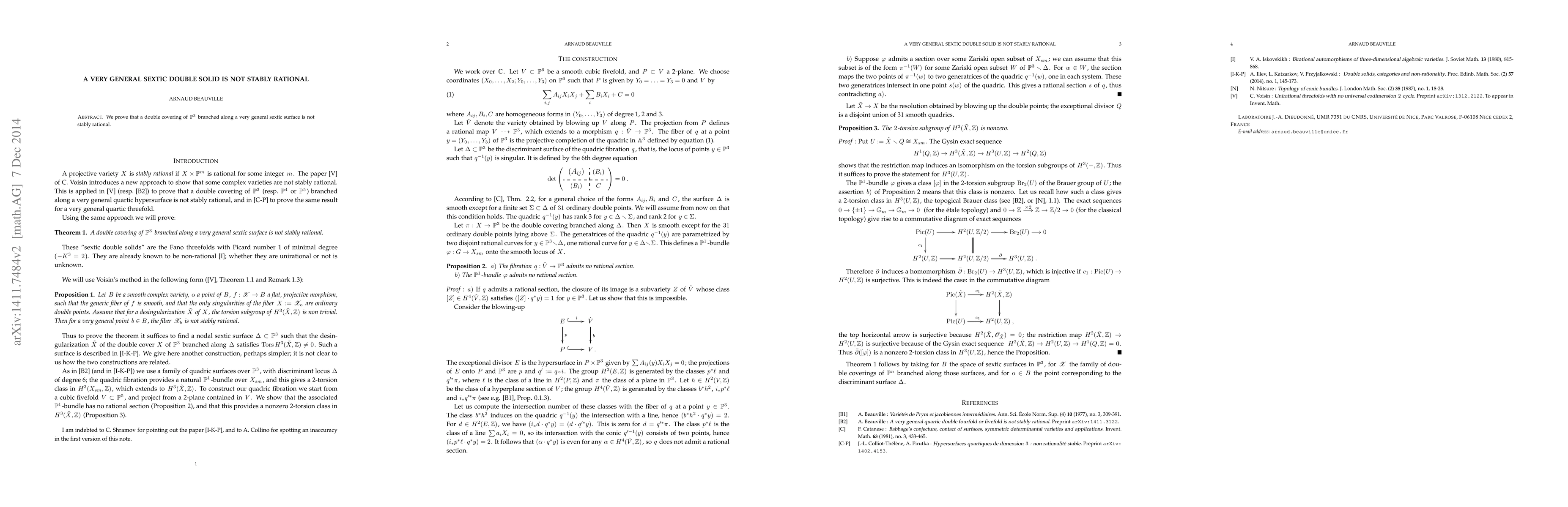 Summary: This paper demonstrates that a double covering of the projective space P^3, constructed with a very general sextic surface as the branch locus, fails to be stably rational. The result contributes to the understanding of the rationality properties of algebraic varieties.