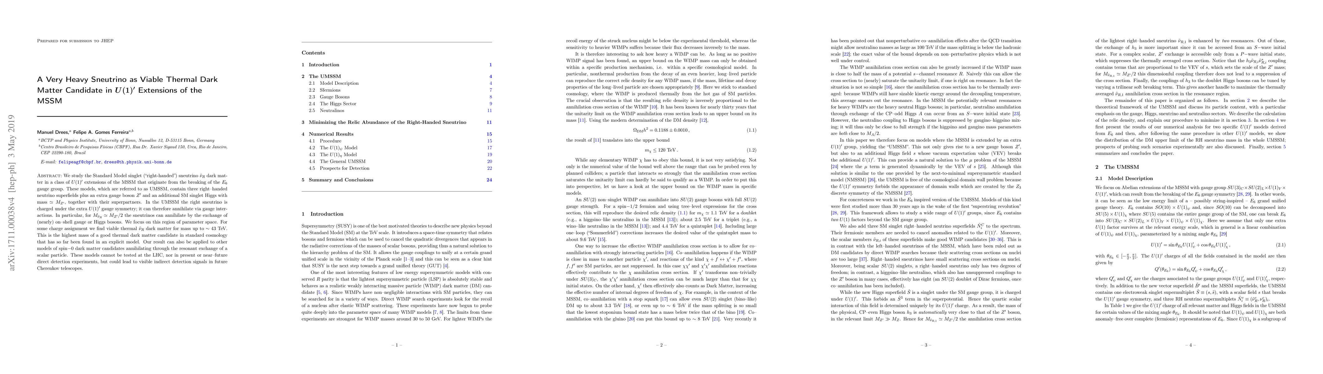 We study the Standard Model singlet ("right-handed") sneutrino $\tilde \nu_R$ dark matter in a class of $U(1)'$ extensions of the MSSM that originate from the breaking of the $E_6$ gauge group. These models, which are referred to as UMSSM, contain three right--handed neutrino superfields plus an extra gauge boson $Z'$ and an additional SM singlet Higgs with mass $\simeq M_{Z'}$, together with their superpartners. In the UMSSM the right sneutrino is charged under the extra $U(1)'$ gauge symmetry; it can therefore annihilate via gauge interactions. In particular, for $M_{\tilde \nu_R} \simeq M_{Z'}/2$ the sneutrinos can annihilate by the exchange of (nearly) on--shell gauge or Higgs bosons. We focus on this region of parameter space. For some charge assignment we find viable thermal $\tilde \nu_R$ dark matter for mass up to $\sim 43$ TeV. This is the highest mass of a good thermal dark matter candidate in standard cosmology that has so far been found in an explicit model. Our result can also be applied to other models of spin$-0$ dark matter candidates annihilating through the resonant exchange of a scalar particle. These models cannot be tested at the LHC, nor in present or near--future direct detection experiments, but could lead to visible indirect detection signals in future Cherenkov telescopes.