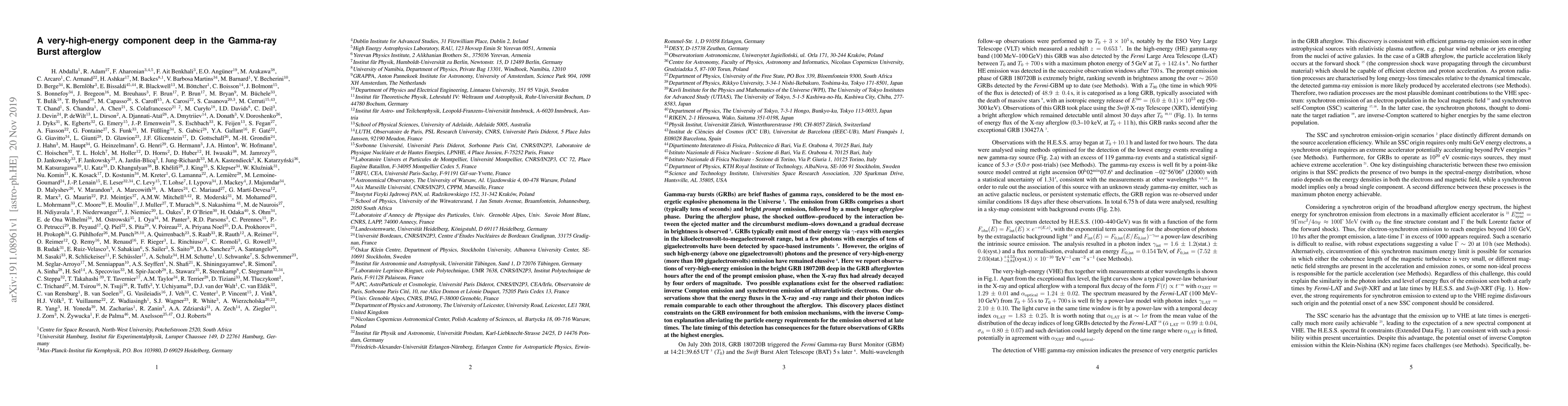 Gamma-ray bursts (GRBs) are brief flashes of gamma rays, considered to be the most energetic explosive phenomena in the Universe. The emission from GRBs comprises a short (typically tens of seconds) and bright prompt emission, followed by a much longer afterglow phase. During the afterglow phase, the shocked outflow -- produced by the interaction between the ejected matter and the circumburst medium -- slows down, and a gradual decrease in brightness is observed. GRBs typically emit most of their energy via gamma-rays with energies in the kiloelectronvolt-to-megaelectronvolt range, but a few photons with energies of tens of gigaelectronvolts have been detected by space-based instruments. However, the origins of such high-energy (above one gigaelectronvolt) photons and the presence of very-high-energy (more than 100 gigaelectronvolts) emission have remained elussive. Here we report observations of very-high-energy emission in the bright GRB 180720B deep in the GRB afterglow -ten hours after the end of the prompt emission phase, when the X-ray flux had already decayed by four orders of magnitude. Two possible explanations exist for the observed radiation: inverse Compton emission and synchrotron emission of ultrarelativistic electrons. Our observations show that the energy fluxes in the X-ray and gamma-ray range and their photon indices remain comparable to each other throughout the afterglow. This discovery places distinct constraints on the GRB environment for both emission mechanisms, with the inverse Compton explanation alleviating the particle energy requirements for the emission observed at late times. The late timing of this detection has consequences for the future observations of GRBs at the highest energies.