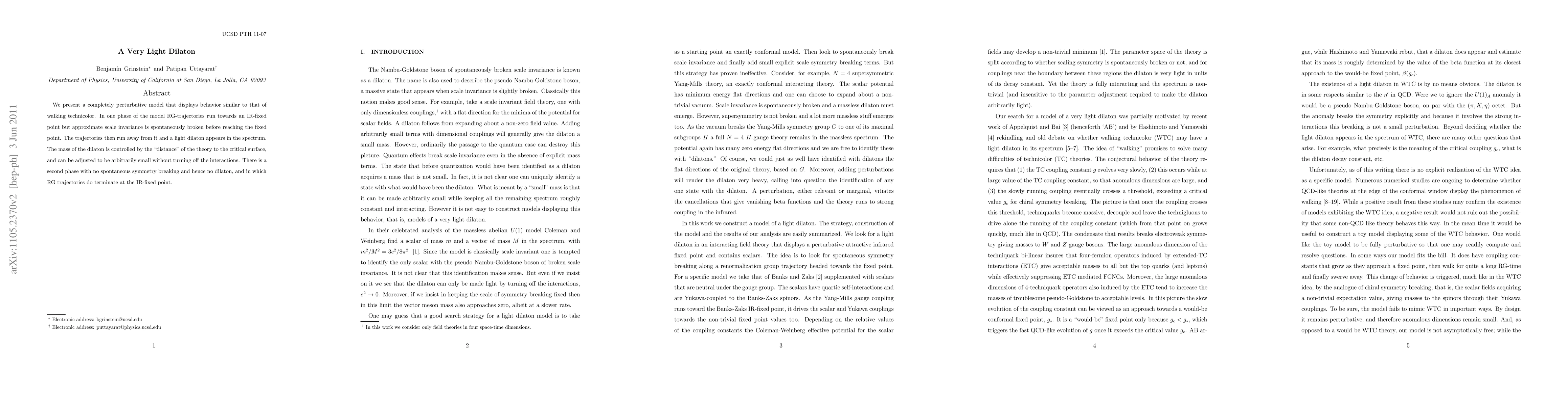 We present a completely perturbative model that displays behavior similar to that of walking technicolor. In one phase of the model RG-trajectories run towards an IR-fixed point but approximate scale invariance is spontaneously broken before reaching the fixed point. The trajectories then run away from it and a light dilaton appears in the spectrum. The mass of the dilaton is controlled by the "distance" of the theory to the critical surface, and can be adjusted to be arbitrarily small without turning off the interactions. There is a second phase with no spontaneous symmetry breaking and hence no dilaton, and in which RG trajectories do terminate at the IR-fixed point.