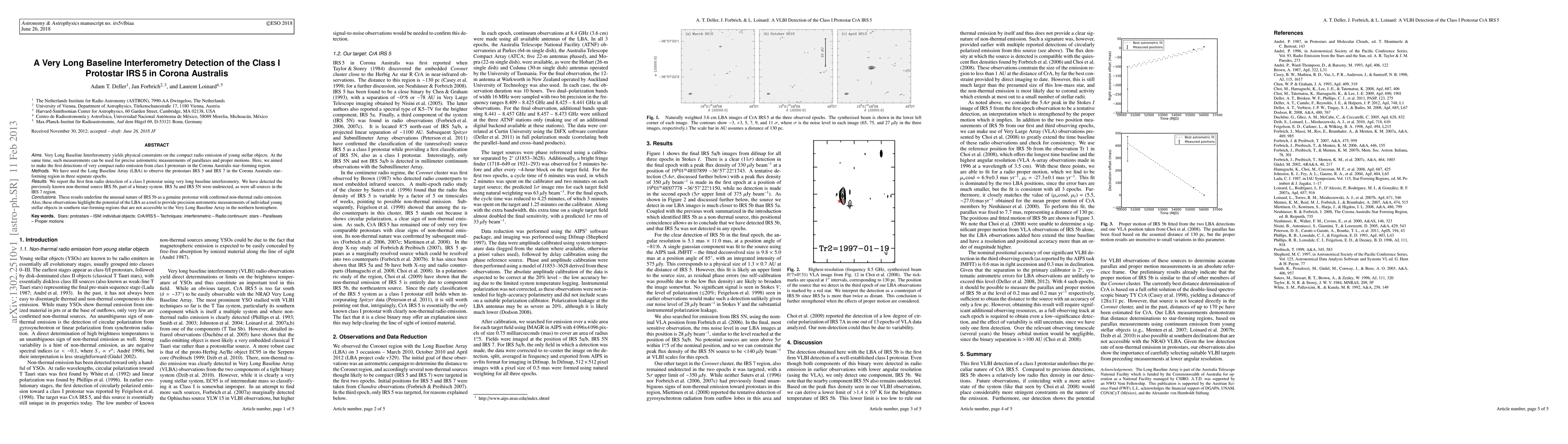 Aims: Very Long Baseline Interferometry yields physical constraints on the compact radio emission of young stellar objects. At the same time, such measurements can be used for precise astrometric measurements of parallaxes and proper motions. Here, we aimed to make the first detections of very compact radio emission from class I protostars in the Corona Australis star-forming region. Methods: We have used the Long Baseline Array (LBA) to observe the protostars IRS 5 and IRS 7 in the Corona Australis star-forming region in three separate epochs Results: We report the first firm radio detection of a class I protostar using very long baseline interferometry. We have detected the previously known non-thermal source IRS 5b, part of a binary system. IRS 5a and IRS 5N were undetected, as were all sources in the IRS 7 region. Conclusions: These results underline the unusual nature of IRS 5b as a genuine protostar with confirmed non-thermal radio emission. Also, these observations highlight the potential of the LBA as a tool to provide precision astrometric measurements of individual young stellar objects in southern star-forming regions that are not accessible to the Very Long Baseline Array in the northern hemisphere.
