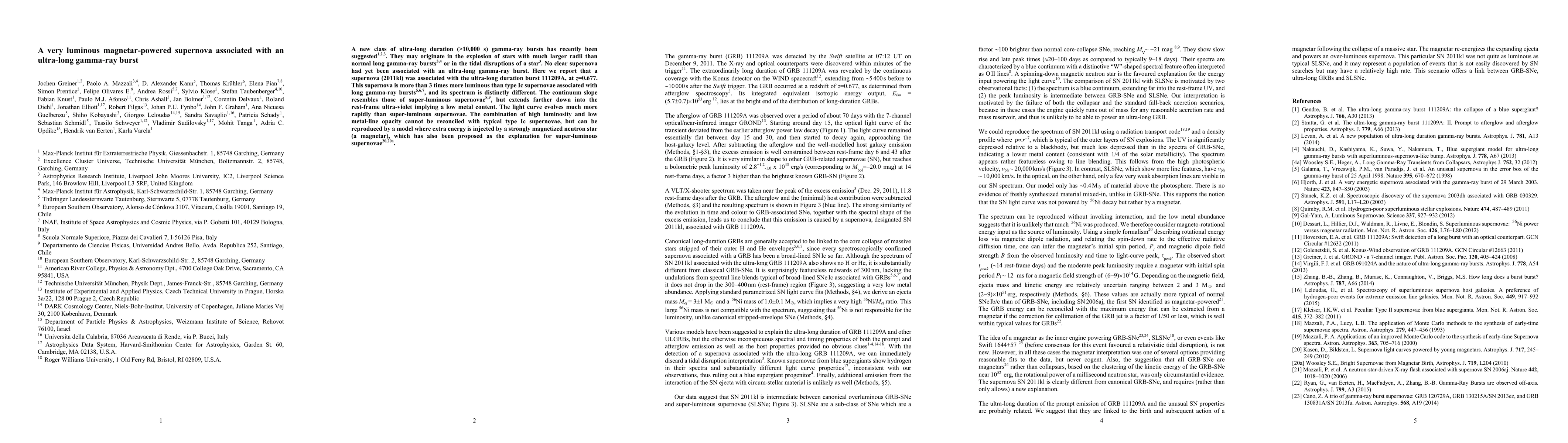 This paper reports the first supernova (2011kl) associated with an ultra-long gamma-ray burst, 111209A, showing a luminosity over three times greater than typical supernovae linked to long gamma-ray bursts. The magnetar-powered model explains its extraordinary brightness and rapid light curve evolution.