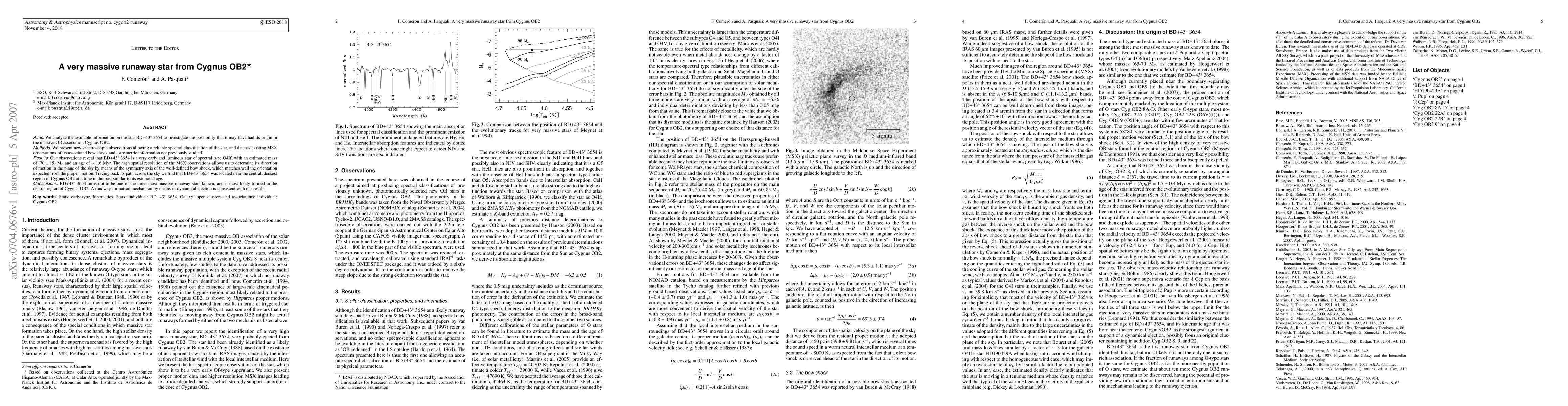 BD+43 3654 is identified as a very massive, luminous O4If star with an estimated mass of 70 solar masses, likely originating from Cygnus OB2. Its bow shock and proper motion suggest it was ejected from the OB association, confirming it as one of the most massive runaway stars.