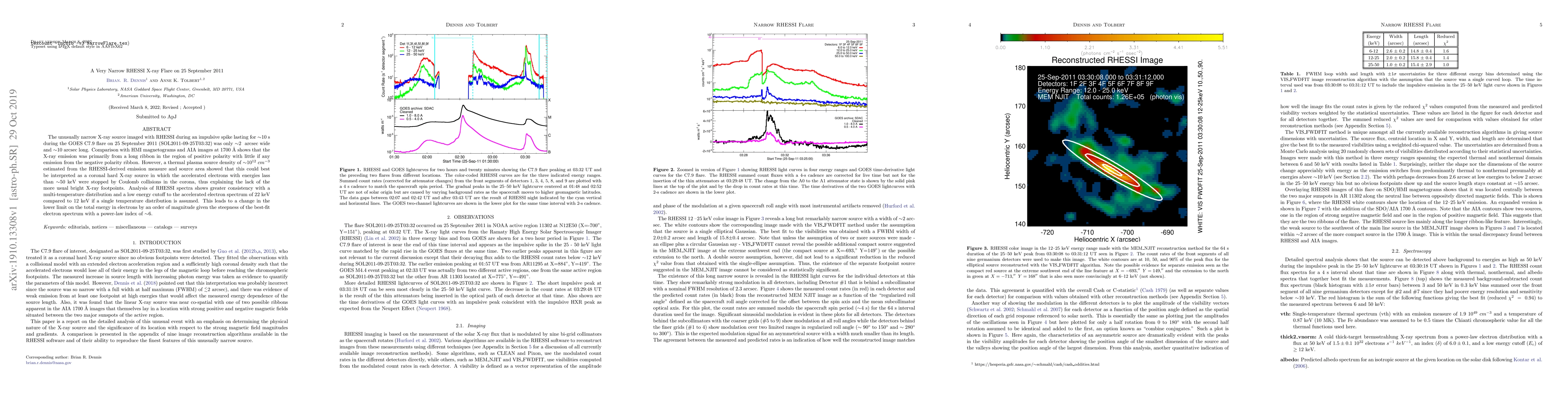 The unusually narrow X-ray source imaged with RHESSI during an impulsive spike lasting for $\sim$10~s during the GOES C7.9 flare on 25 September 2011 (SOL2011-09-25T03:32) was only $\sim$2~ arcsec wide and $\sim$10~arcsec long. Comparison with HMI magnetograms and AIA images at 1700~\AA~shows that the X-ray emission was primarily from a long ribbon in the region of positive polarity with little if any emission from the negative polarity ribbon. However, a thermal plasma source density of $\sim$10$^{12}~cm^{-3}$ estimated from the RHESSI-derived emission measure and source area showed that this could best be interpreted as a coronal hard X-ray source in which the accelerated electrons with energies lass than $\sim$50~keV were stopped by Coulomb collisions in the corona, thus explaining the lack of the more usual bright X-ray footpoints. Analysis of RHESSI spectra shows greater consistency with a multi-temperature distribution and a low energy cutoff to the accelerated electron spectrum of 22 keV compared to 12 keV if a single temperature distribution is assumed. This leads to a change in the lower limit on the total energy in electrons by an order of magnitude given the steepness of the best-fit electron spectrum with a power-law index of $\sim$6.