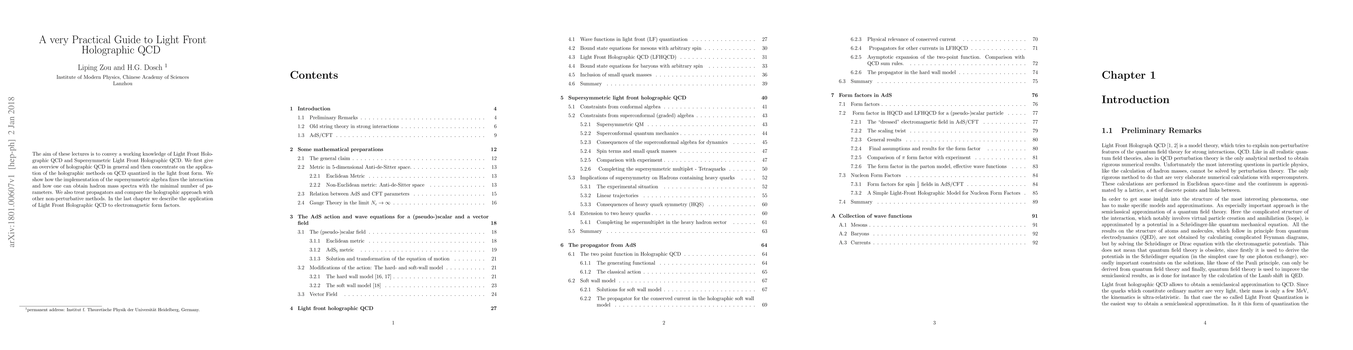 The aim of these lectures is to convey a working knowledge of Light Front Holographic QCD and Supersymmetric Light Front Holographic QCD. We first give an overview of holographic QCD in general and then concentrate on the application of the holographic methods on QCD quantized in the light front form. We show how the implementation of the supersymmetric algebra fixes the interaction and how one can obtain hadron mass spectra with the minimal number of parameters. We also treat propagators and compare the holographic approach with other non-perturbative methods. In the last chapter we describe the application of Light Front Holographic QCD to electromagnetic form factors.