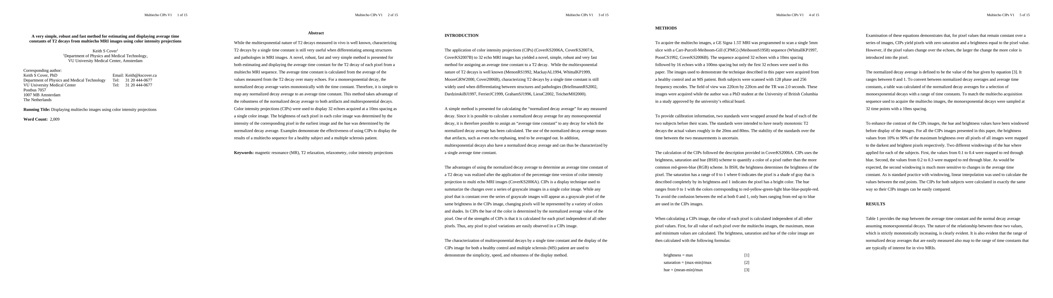 While the multiexponential nature of T2 decays measured in vivo is well known, characterizing T2 decays by a single time constant is still very useful when differentiating among structures and pathologies in MRI images. A novel, robust, fast and very simple method is presented for both estimating and displaying the average time constant for the T2 decay of each pixel from a multiecho MRI sequence. The average time constant is calculated from the average of the values measured from the T2 decay over many echoes. For a monoexponential decay, the normalized decay average varies monotonically with the time constant. Therefore, it is simple to map any normalized decay average to an average time constant. This method takes advantage of the robustness of the normalized decay average to both artifacts and multiexponential decays. Color intensity projections (CIPs) were used to display 32 echoes acquired at a 10ms spacing as a single color image. The brightness of each pixel in each color image was determined by the intensity of the corresponding pixel in the earliest image and the hue was determined by the normalized decay average. Examples demonstrate the effectiveness of using CIPs to display the results of a multiecho sequence for a healthy subject and a multiple sclerosis patient.
