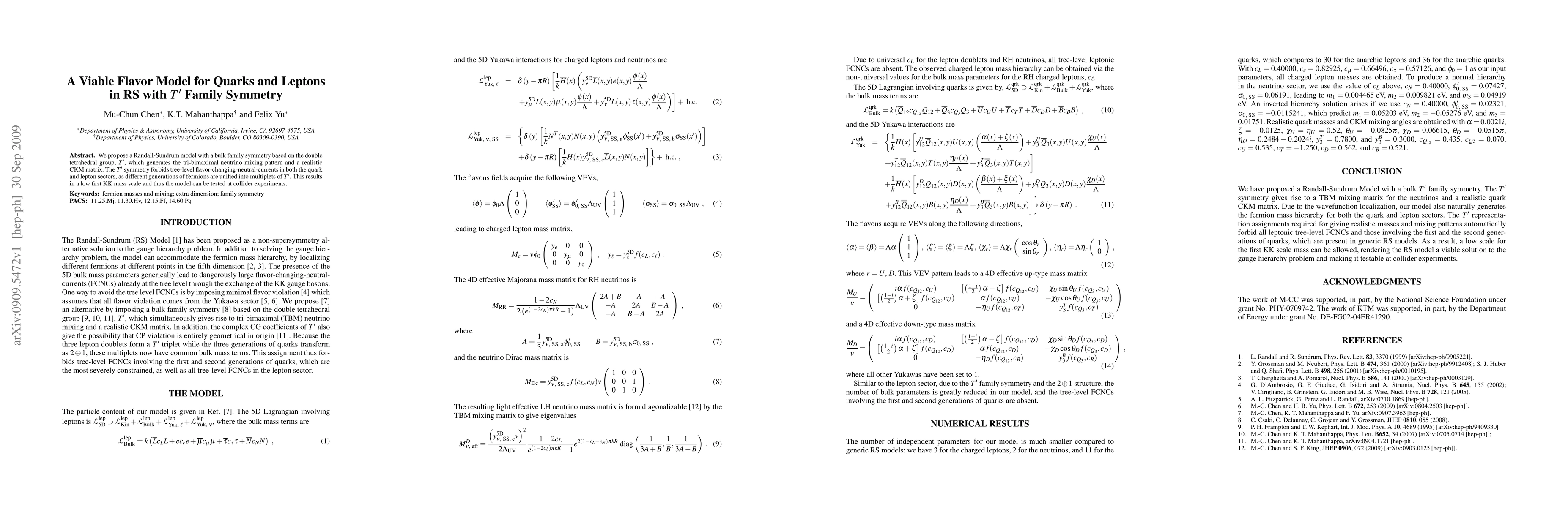 This paper proposes a Randall-Sundrum model utilizing a bulk family symmetry based on the T' group to generate tri-bimaximal neutrino mixing and a realistic CKM matrix. The T' symmetry ensures no tree-level flavor-changing-neutral-currents, making the model testable at collider experiments due to its low first KK mass scale.