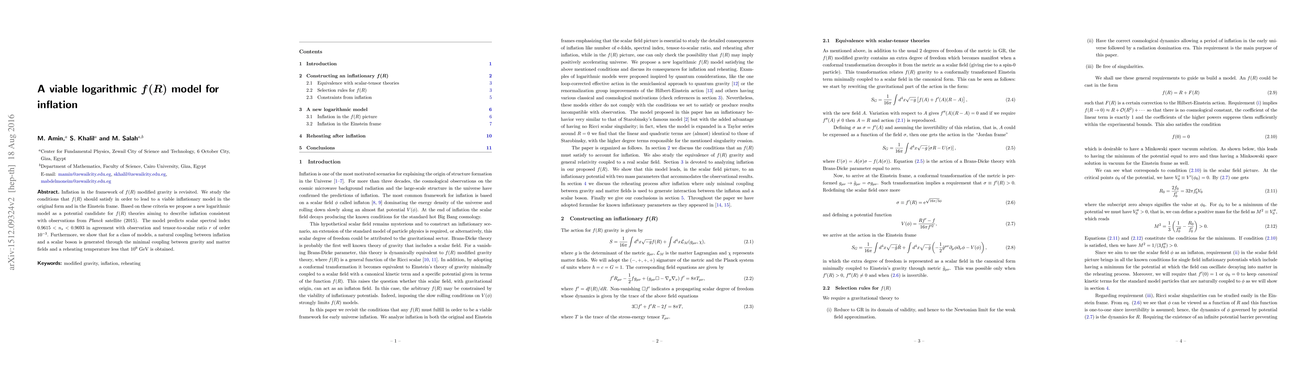 This paper proposes a new logarithmic $f(R)$ model for inflation within modified gravity frameworks, ensuring consistency with observational data from the Planck satellite. The model predicts a scalar spectral index and tensor-to-scalar ratio in agreement with observations, while also generating a natural coupling between inflation and a scalar boson.