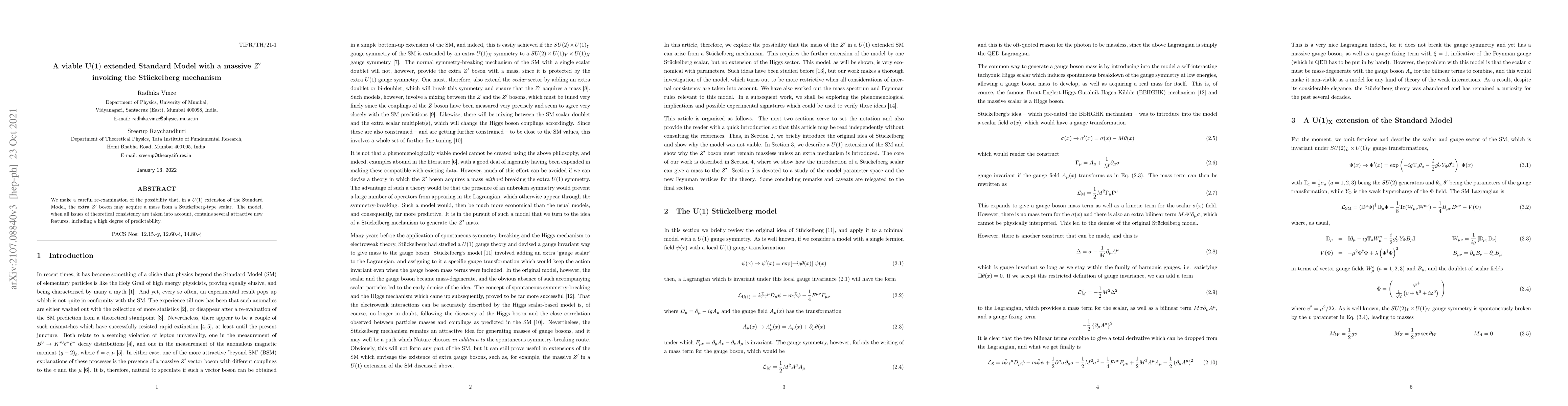 This paper explores a U(1) extended Standard Model where a massive Z' boson acquires its mass via a Stueckelberg mechanism, offering a high degree of predictability and theoretical consistency. The model introduces several attractive new features.