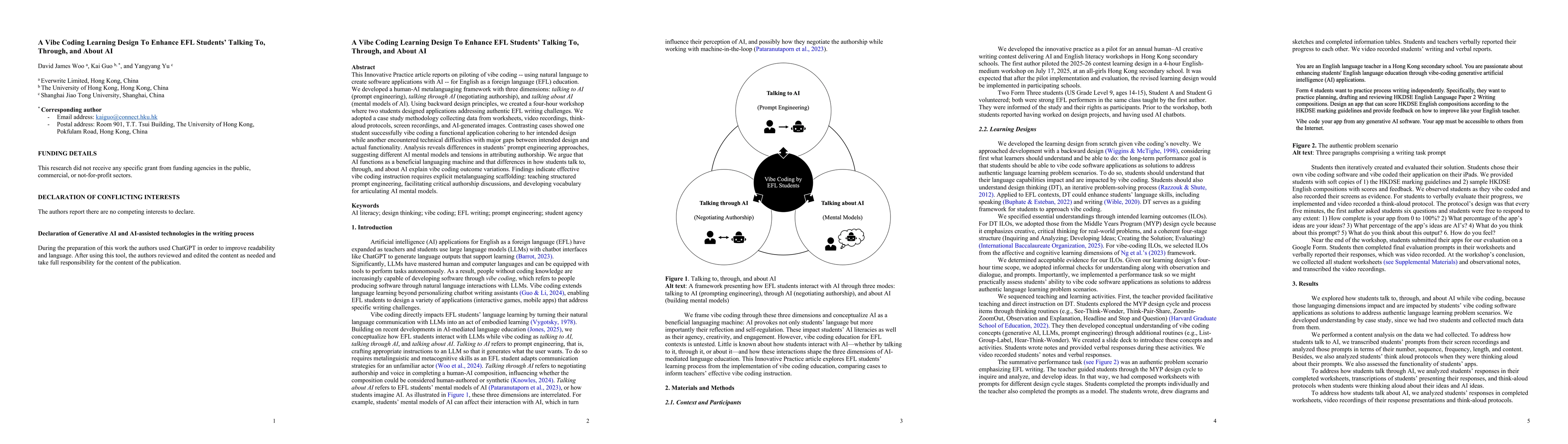 This innovative practice article reports on the piloting of vibe coding (using natural language to create software applications with AI) for English as a Foreign Language (EFL) education. We developed a human-AI meta-languaging framework with three dimensions: talking to AI (prompt engineering), talking through AI (negotiating authorship), and talking about AI (mental models of AI). Using backward design principles, we created a four-hour workshop where two students designed applications addressing authentic EFL writing challenges. We adopted a case study methodology, collecting data from worksheets and video recordings, think-aloud protocols, screen recordings, and AI-generated images. Contrasting cases showed one student successfully vibe coding a functional application cohering to her intended design, while another encountered technical difficulties with major gaps between intended design and actual functionality. Analysis reveals differences in students' prompt engineering approaches, suggesting different AI mental models and tensions in attributing authorship. We argue that AI functions as a beneficial languaging machine, and that differences in how students talk to, through, and about AI explain vibe coding outcome variations. Findings indicate that effective vibe coding instruction requires explicit meta-languaging scaffolding, teaching structured prompt engineering, facilitating critical authorship discussions, and developing vocabulary for articulating AI mental models.