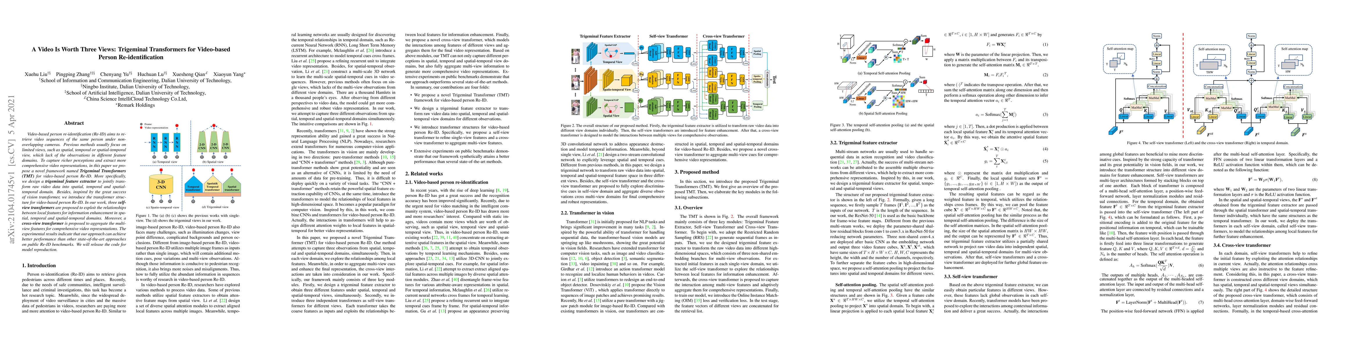 This paper proposes Trigeminal Transformers (TMT) for video-based person re-identification, utilizing a trigeminal feature extractor to transform raw video data into spatial, temporal, and spatial-temporal domains. The framework employs self-view transformers for local feature relationships and a cross-view transformer for multi-view feature aggregation, achieving superior performance on public benchmarks.