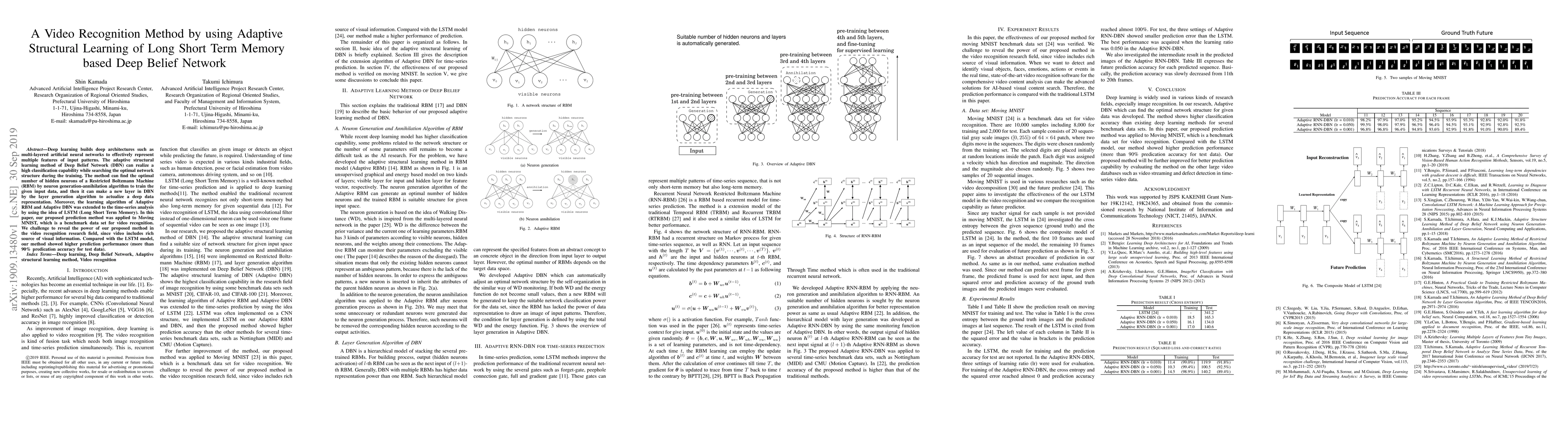 Deep learning builds deep architectures such as multi-layered artificial neural networks to effectively represent multiple features of input patterns. The adaptive structural learning method of Deep Belief Network (DBN) can realize a high classification capability while searching the optimal network structure during the training. The method can find the optimal number of hidden neurons of a Restricted Boltzmann Machine (RBM) by neuron generation-annihilation algorithm to train the given input data, and then it can make a new layer in DBN by the layer generation algorithm to actualize a deep data representation. Moreover, the learning algorithm of Adaptive RBM and Adaptive DBN was extended to the time-series analysis by using the idea of LSTM (Long Short Term Memory). In this paper, our proposed prediction method was applied to Moving MNIST, which is a benchmark data set for video recognition. We challenge to reveal the power of our proposed method in the video recognition research field, since video includes rich source of visual information. Compared with the LSTM model, our method showed higher prediction performance (more than 90% predication accuracy for test data).