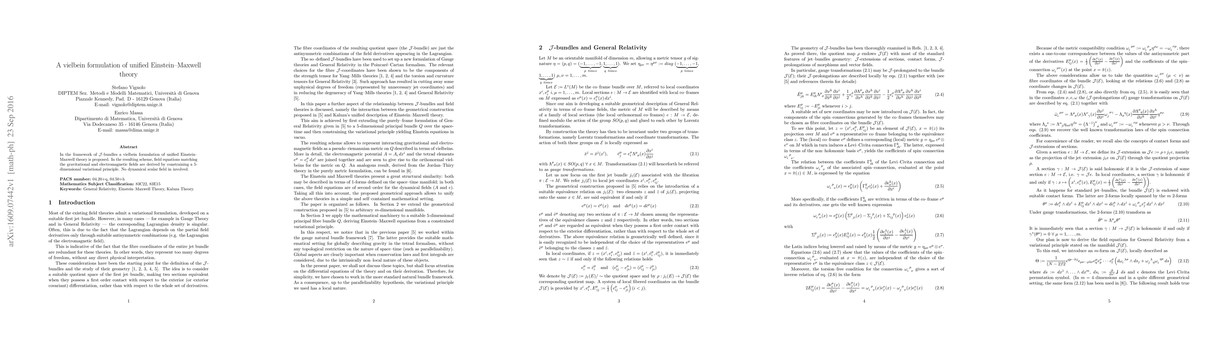 In the framework of J-bundles a vielbein formulation of unified Einstein-Maxwell theory is proposed. In the resulting scheme, field equations matching the gravitational and electromagnetic fields are derived by constraining a five-dimensional variational principle. No dynamical scalar field is involved.