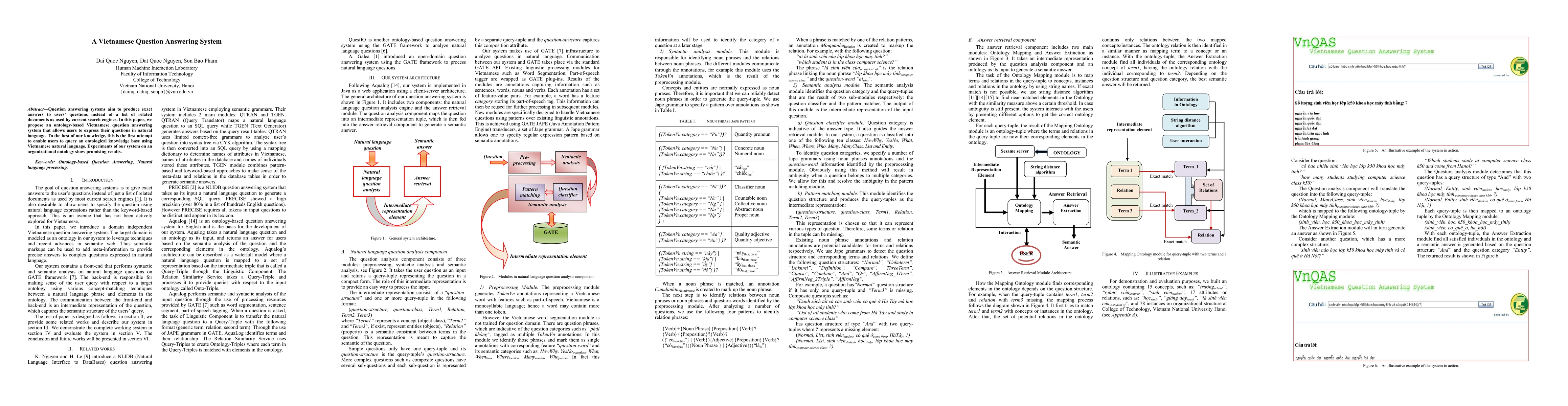 This paper introduces an ontology-based Vietnamese question answering system that enables natural language queries, marking the first attempt to use Vietnamese in such systems. Experimental results on an organizational ontology demonstrate promising performance.