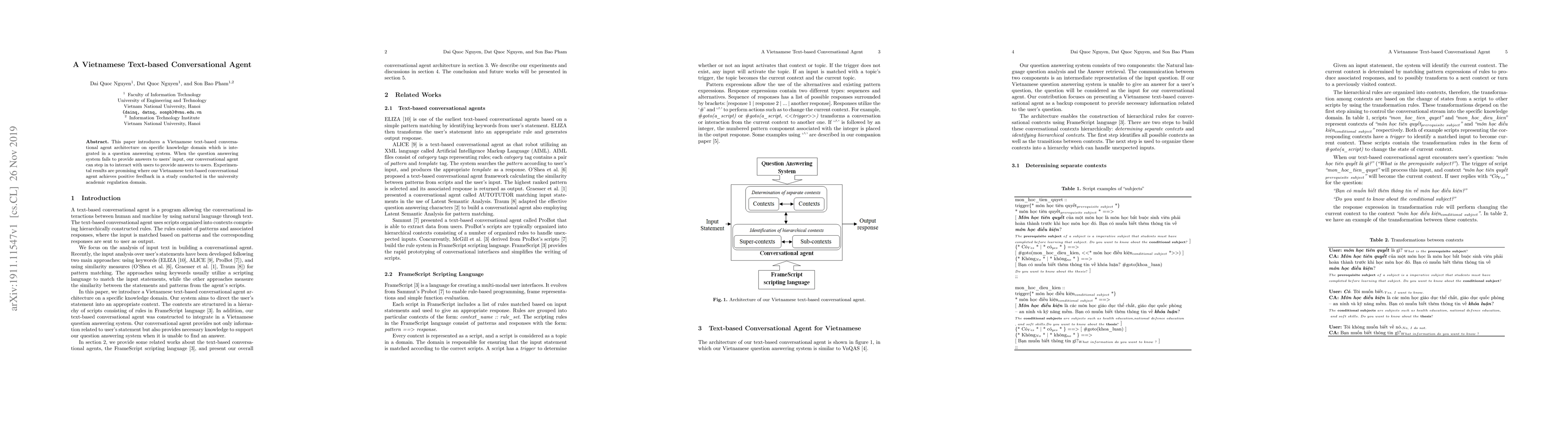 This paper presents a Vietnamese text-based conversational agent designed for a specific knowledge domain, integrated into a question-answering system. The conversational agent successfully engages users when the system fails, receiving positive feedback in a university academic regulation study.