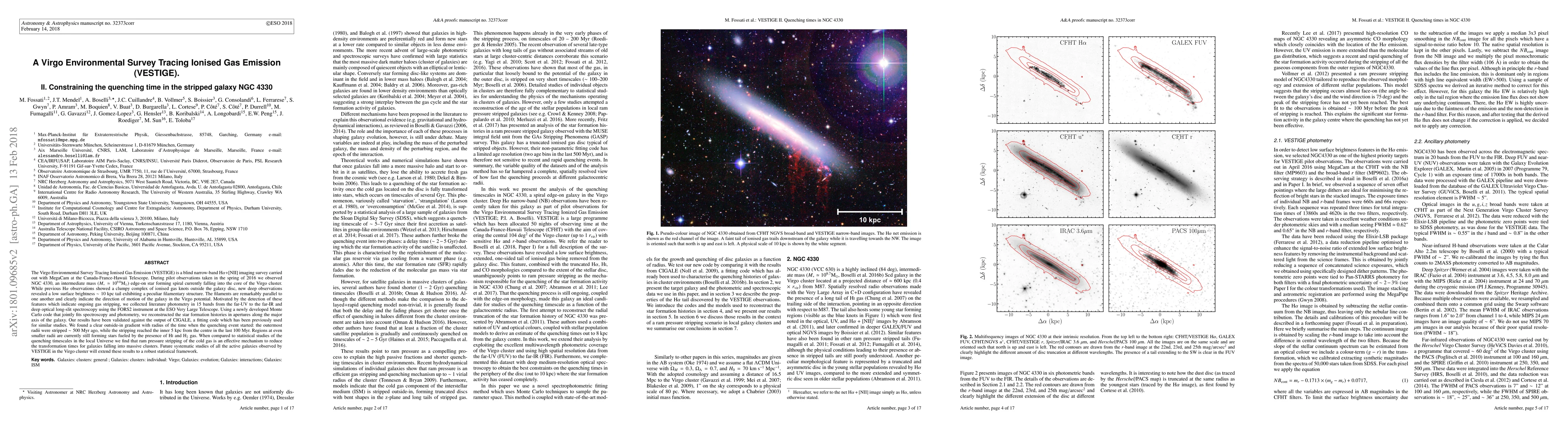 The VESTIGE survey reveals a low surface brightness tail in NGC 4330, indicating gas stripping as it falls into the Virgo cluster. Analysis shows that quenching of star formation began 500 Myr ago in the outer regions, with the inner 5 kpc still active, suggesting ram pressure stripping is an effective quenching mechanism.
