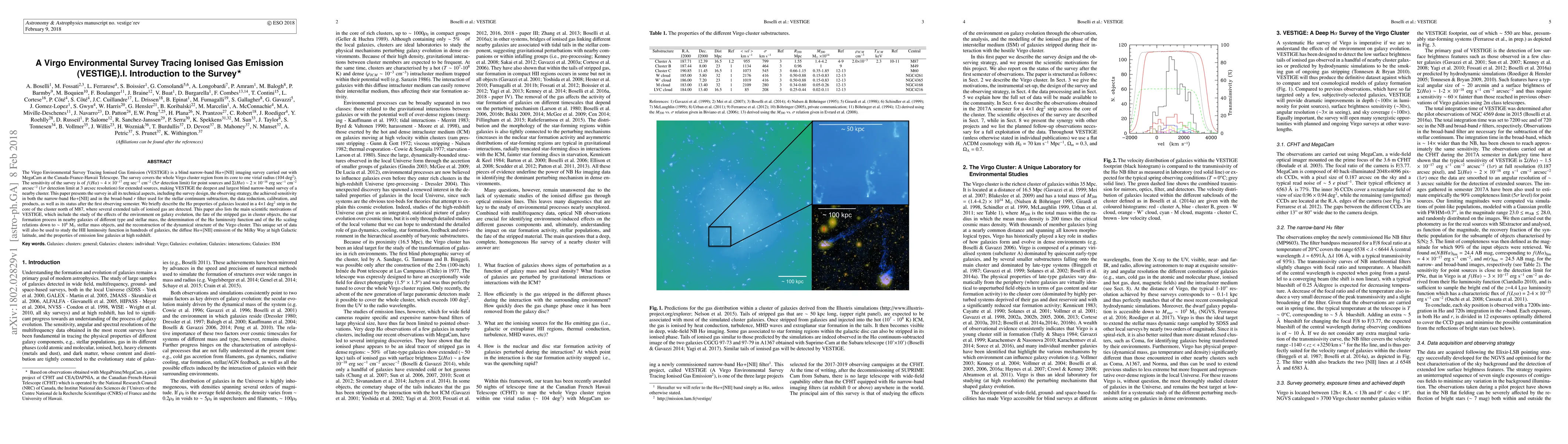 The VESTIGE survey is a comprehensive blind narrow-band Halpha+[NII] imaging survey of the Virgo cluster, conducted with MegaCam at the Canada-France-Hawaii Telescope, aiming to study galaxy evolution, stripped gas, star formation, and the cluster's dynamical structure. The survey achieved high sensitivity and covers a large area, providing deep insights into ionized gas emissions.