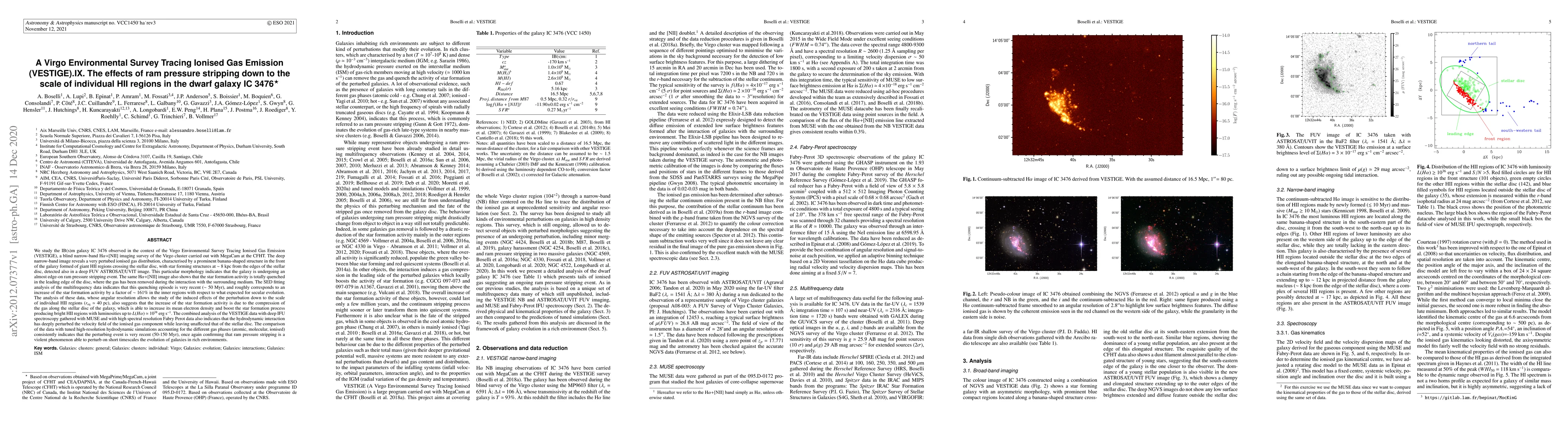 This paper investigates the effects of ram pressure stripping on the dwarf galaxy IC 3476 within the Virgo cluster, revealing a banana-shaped ionized gas structure formed by giant HII regions. The study shows that star formation is quenched in the leading edge due to the removal of gas, while an increase in star formation activity is observed in the inner regions, likely due to gas compression.
