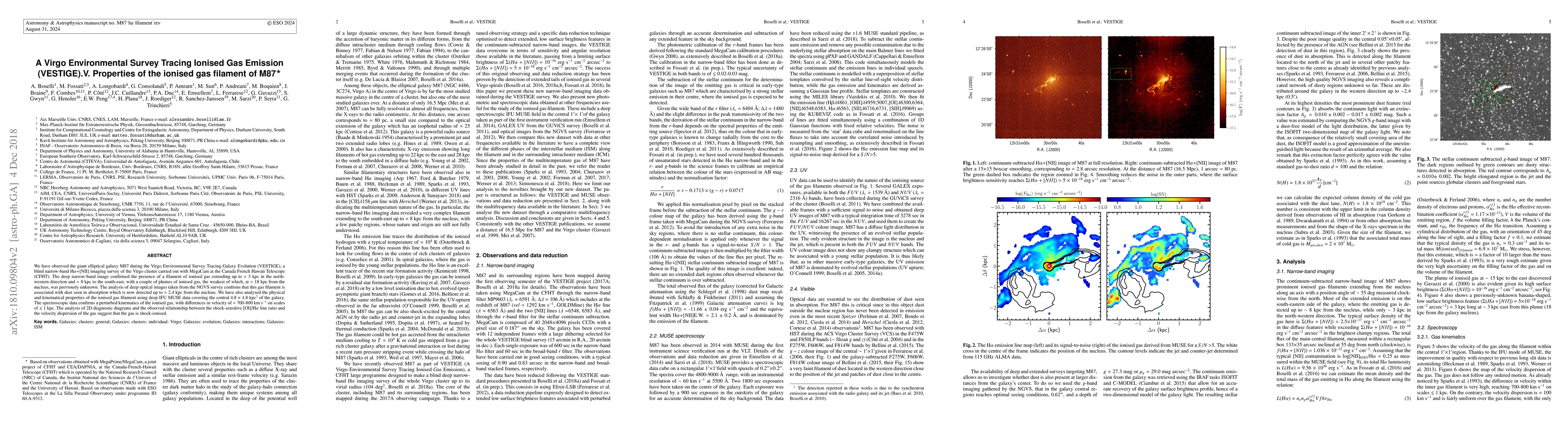 This study observes the ionised gas filament in M87 using VESTIGE survey data, revealing a filament extending up to 8 kpc with perturbed kinematics and shock-ionised gas, as evidenced by the [OI]/Halpha line ratio and velocity differences.