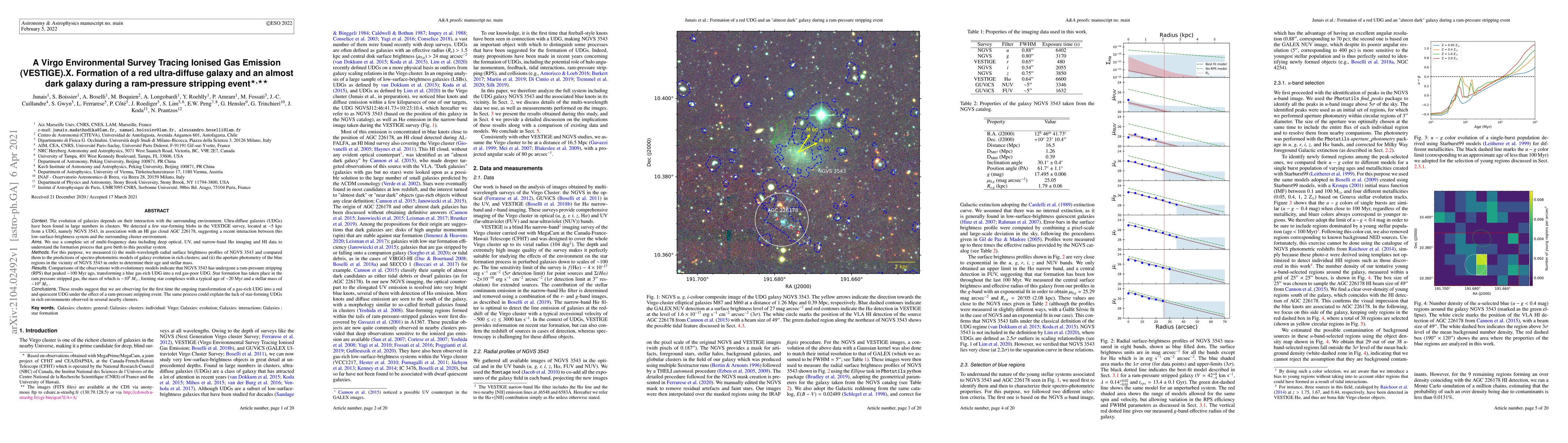 The VESTIGE survey reveals the transformation of a gas-rich ultra-diffuse galaxy (NGVS 3543) into a red, quiescent state via ram-pressure stripping, accompanied by the formation of star-forming complexes and a nearby almost dark galaxy. This process may explain the scarcity of star-forming UDGs in dense clusters.