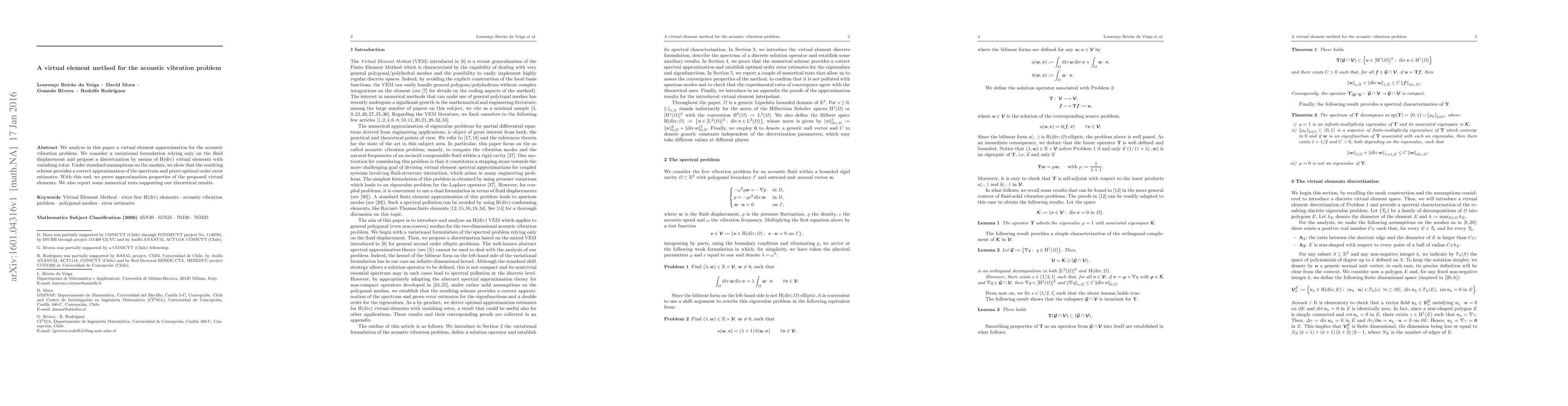 This paper presents a virtual element method for solving acoustic vibration problems using fluid displacement. The method employs H(div) virtual elements and demonstrates optimal error estimates and accurate spectral approximation, supported by numerical tests.