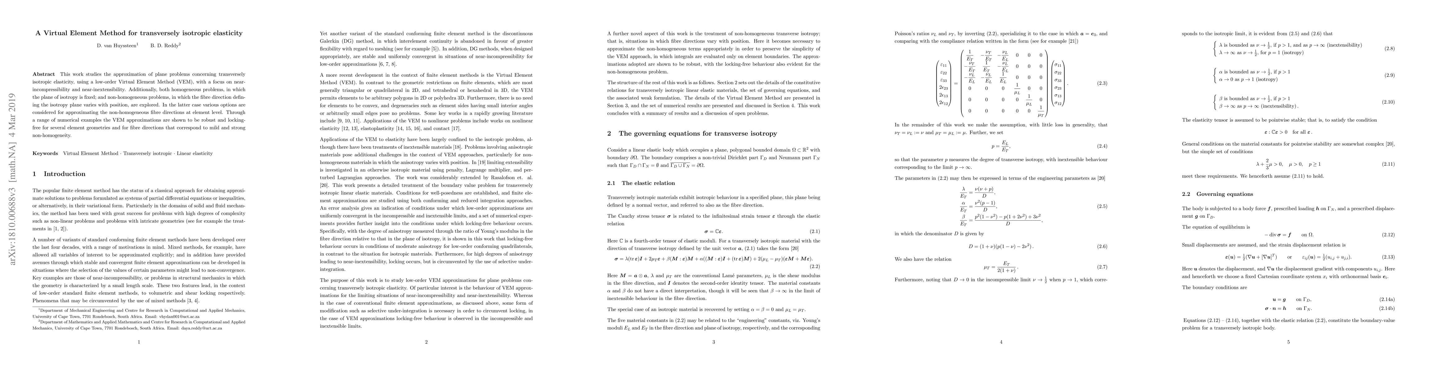 This paper proposes a low-order Virtual Element Method (VEM) for approximating plane problems in transversely isotropic elasticity, demonstrating robustness and locking-free behavior for both near-incompressible and near-inextensible conditions. It also explores both homogeneous and non-homogeneous scenarios, showing effective handling of varying fibre directions.