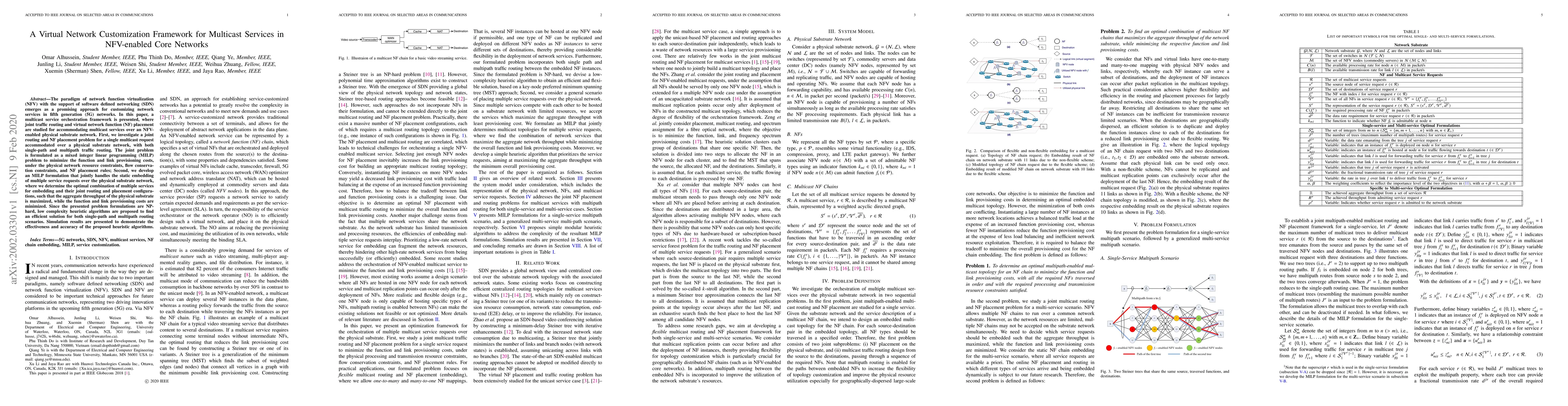 This paper presents a multicast service orchestration framework for NFV-enabled core networks using SDN. It formulates joint routing and virtual network function placement as MILP problems to minimize costs while maximizing throughput, and proposes heuristic algorithms to solve these NP-hard problems efficiently.