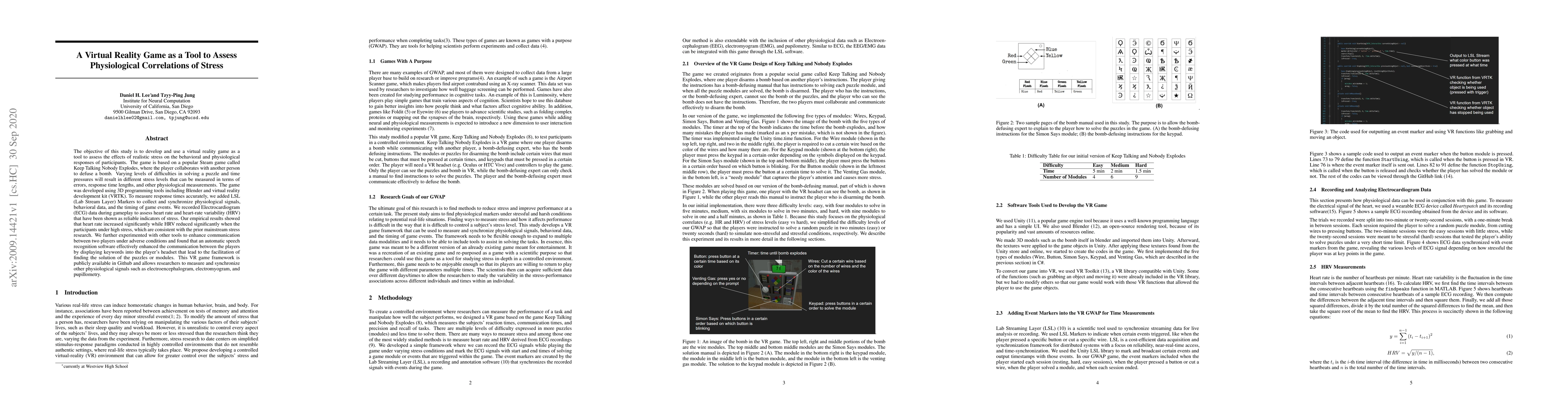 This study developed a virtual reality game to assess stress by measuring participants' physiological and behavioral responses while playing Keep Talking Nobody Explodes. The game's difficulty and time pressures induced varying stress levels, which were measured via ECG to observe heart rate and HRV changes, confirming increased stress under high-pressure scenarios. The framework is open for further physiological signal integration.