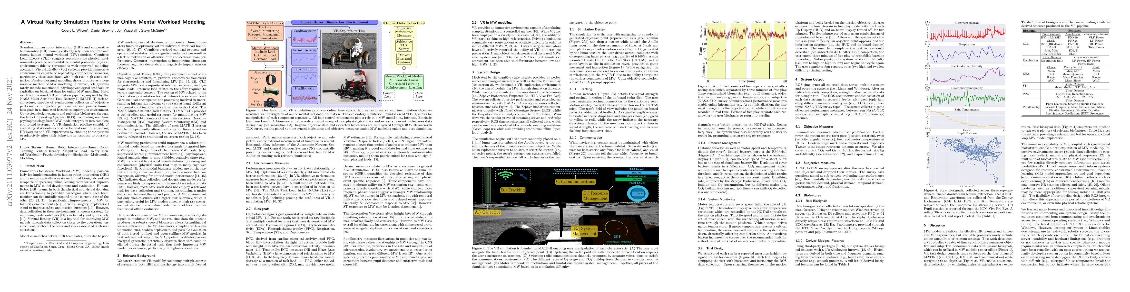Seamless human robot interaction (HRI) and cooperative human-robot (HR) teaming critically rely upon accurate and timely human mental workload (MW) models. Cognitive Load Theory (CLT) suggests representative physical environments produce representative mental processes; physical environment fidelity corresponds with improved modeling accuracy. Virtual Reality (VR) systems provide immersive environments capable of replicating complicated scenarios, particularly those associated with high-risk, high-stress scenarios. Passive biosignal modeling shows promise as a noninvasive method of MW modeling. However, VR systems rarely include multimodal psychophysiological feedback or capitalize on biosignal data for online MW modeling. Here, we develop a novel VR simulation pipeline, inspired by the NASA Multi-Attribute Task Battery II (MATB-II) task architecture, capable of synchronous collection of objective performance, subjective performance, and passive human biosignals in a simulated hazardous exploration environment. Our system design extracts and publishes biofeatures through the Robot Operating System (ROS), facilitating real time psychophysiology-based MW model integration into complete end-to-end systems. A VR simulation pipeline capable of evaluating MWs online could be foundational for advancing HR systems and VR experiences by enabling these systems to adaptively alter their behaviors in response to operator MW.