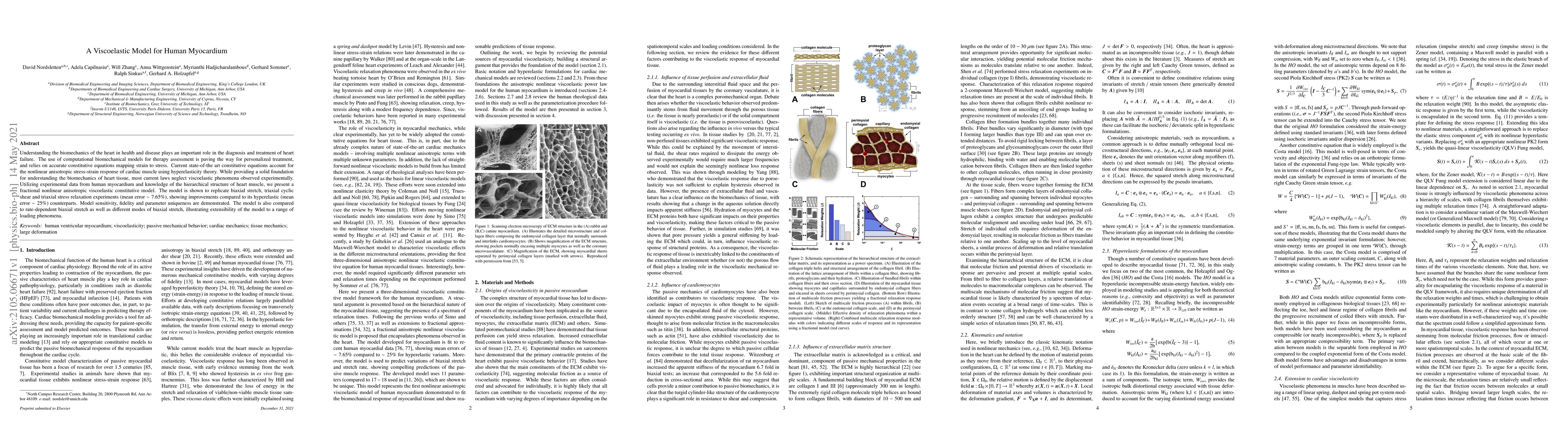Understanding the biomechanics of the heart in health and disease plays an important role in the diagnosis and treatment of heart failure. The use of computational biomechanical models for therapy assessment is paving the way for personalized treatment, and relies on accurate constitutive equations mapping strain to stress. Current state-of-the art constitutive equations account for the nonlinear anisotropic stress-strain response of cardiac muscle using hyperelasticity theory. While providing a solid foundation for understanding the biomechanics of heart tissue, most current laws neglect viscoelastic phenomena observed experimentally. Utilizing experimental data from human myocardium and knowledge of the hierarchical structure of heart muscle, we present a fractional nonlinear anisotropic viscoelastic constitutive model. The model is shown to replicate biaxial stretch, triaxial cyclic shear and triaxial stress relaxation experiments (mean error ~7.65%), showing improvements compared to its hyperelastic (mean error ~25%) counterparts. Model sensitivity, fidelity and parameter uniqueness are demonstrated. The model is also compared to rate-dependent biaxial stretch as well as different modes of biaxial stretch, illustrating extensibility of the model to a range of loading phenomena.