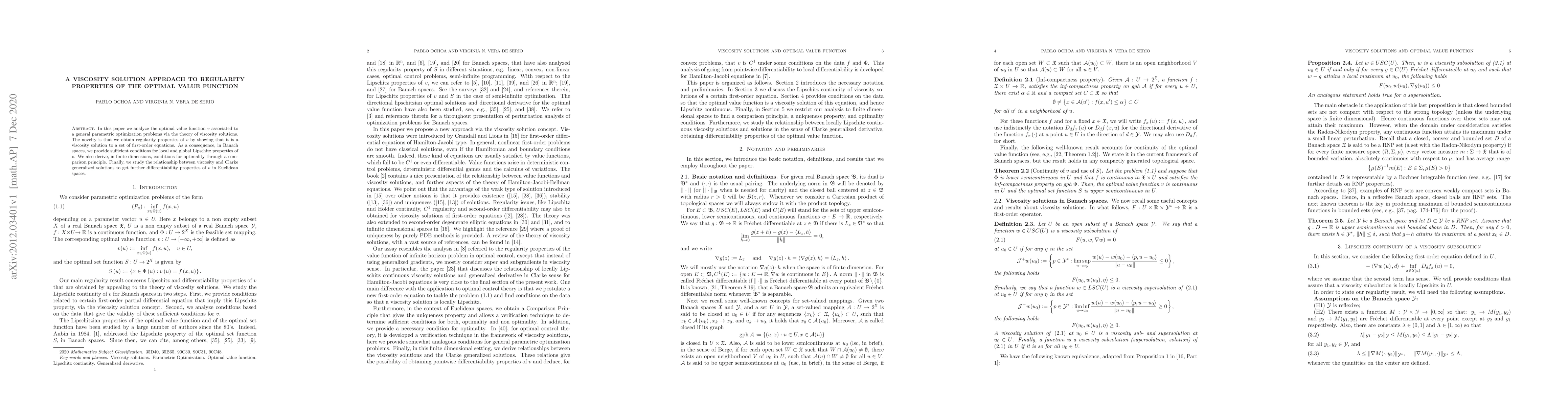 In this paper we analyze the optimal value function $v$ associated to a general parametric optimization problems via the theory of viscosity solutions. The novelty is that we obtain regularity properties of $v$ by showing that it is a viscosity solution to a set of first-order equations. As a consequence, in Banach spaces, we provide sufficient conditions for local and global Lipschitz properties of $v$. We also derive, in finite dimensions, conditions for optimality through a comparison principle. Finally, we study the relationship between viscosity and Clarke generalized solutions to get further differentiability properties of $v$ in Euclidean spaces.