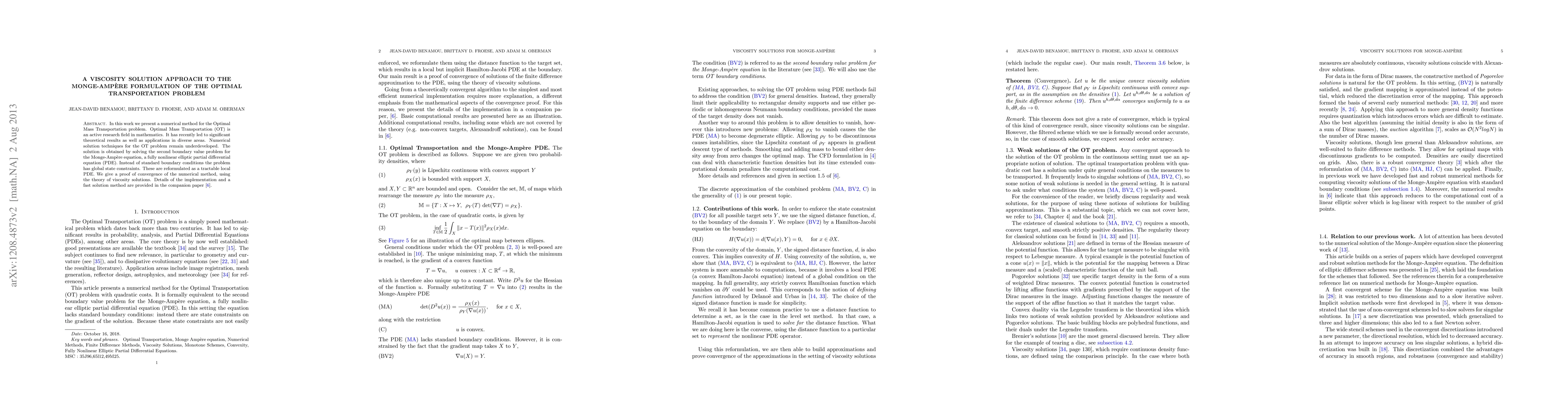 In this work we present a numerical method for the Optimal Mass Transportation problem. Optimal Mass Transportation (OT) is an active research field in mathematics.It has recently led to significant theoretical results as well as applications in diverse areas. Numerical solution techniques for the OT problem remain underdeveloped. The solution is obtained by solving the second boundary value problem for the MA equation, a fully nonlinear elliptic partial differential equation (PDE). Instead of standard boundary conditions the problem has global state constraints. These are reformulated as a tractable local PDE. We give a proof of convergence of the numerical method, using the theory of viscosity solutions. Details of the implementation and a fast solution method are provided in the companion paper arXiv:1208.4870.