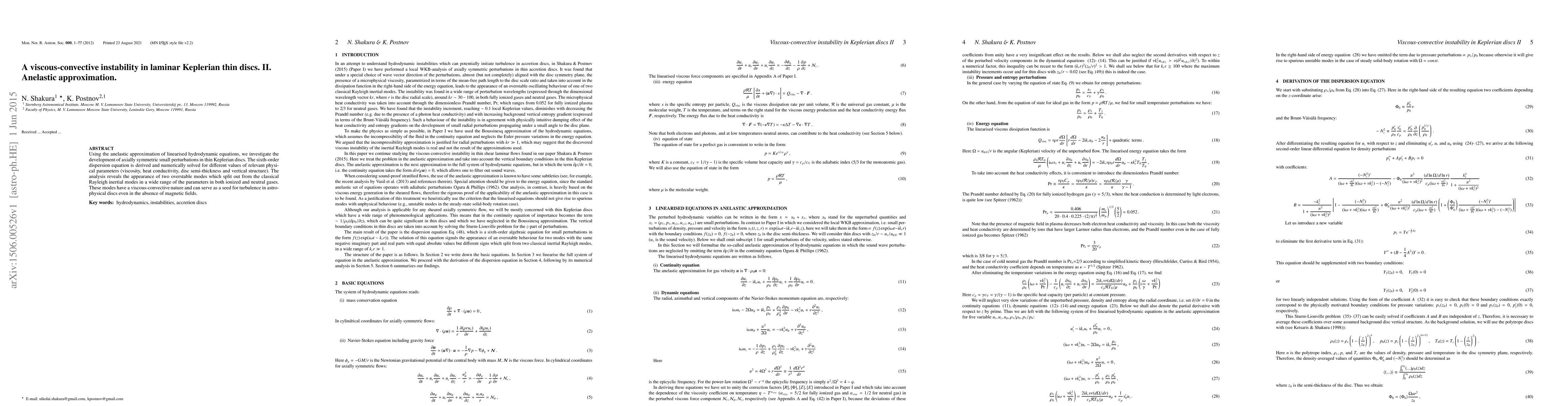 This paper investigates axially symmetric small perturbations in thin Keplerian discs using the anelastic approximation. It reveals the emergence of two overstable viscous-convective modes that can initiate turbulence in astrophysical discs, independent of magnetic fields.