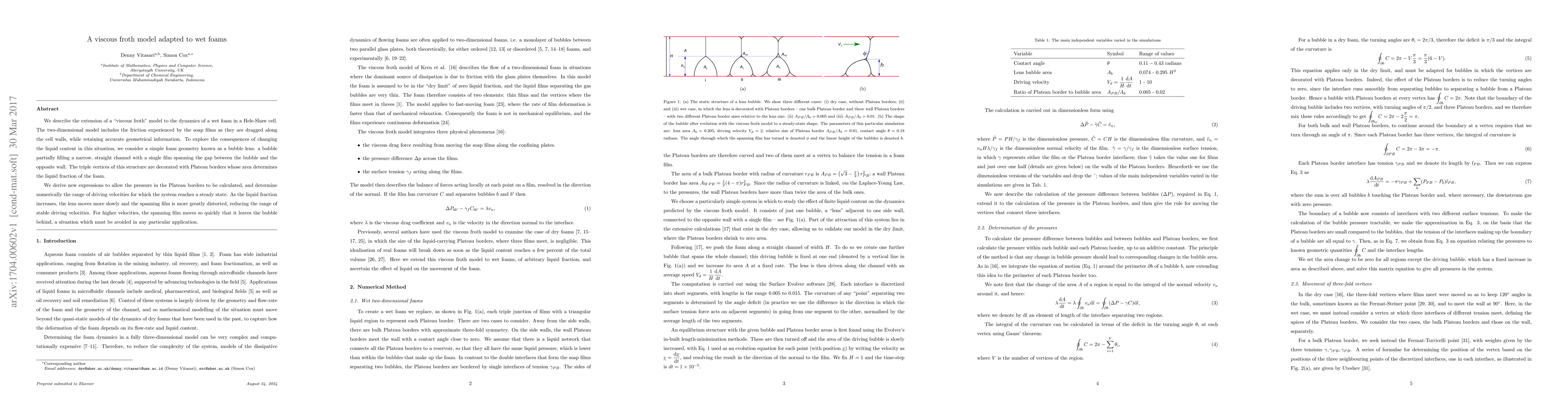 This paper extends a viscous froth model to study wet foam dynamics in a Hele-Shaw cell, focusing on a bubble lens geometry. It derives new expressions to calculate the pressure in Plateau borders and determines the range of driving velocities for steady-state conditions, finding that increased liquid content reduces the stable velocity range.