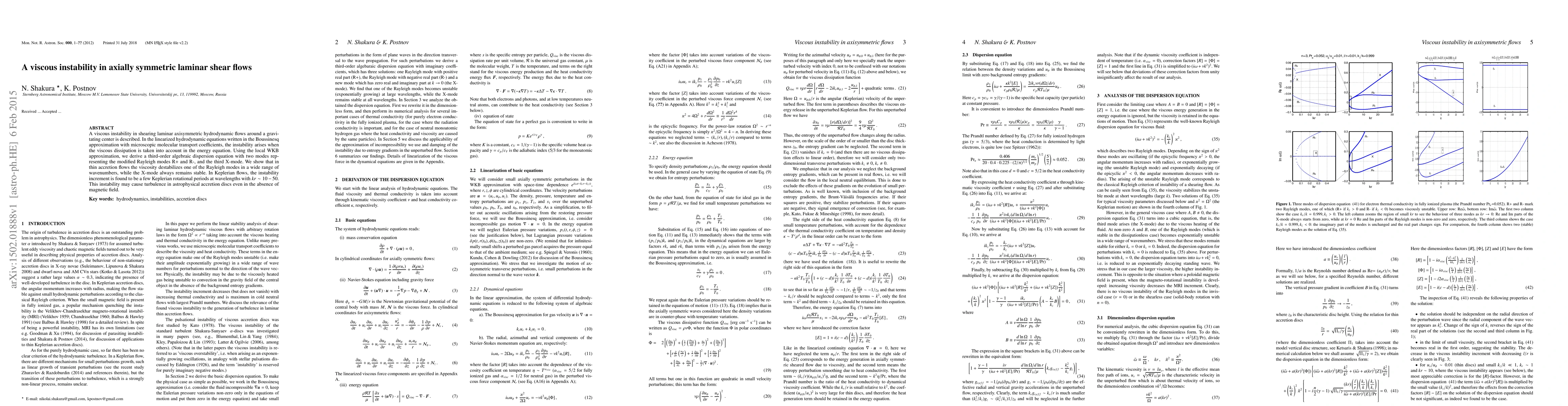 This paper investigates a viscous instability in axisymmetric laminar shear flows around a gravitating center, revealing that viscosity destabilizes one Rayleigh mode in thin accretion flows. The derived dispersion equation identifies three modes, with the X-mode remaining stable, suggesting potential turbulence in astrophysical accretion discs without magnetic fields.