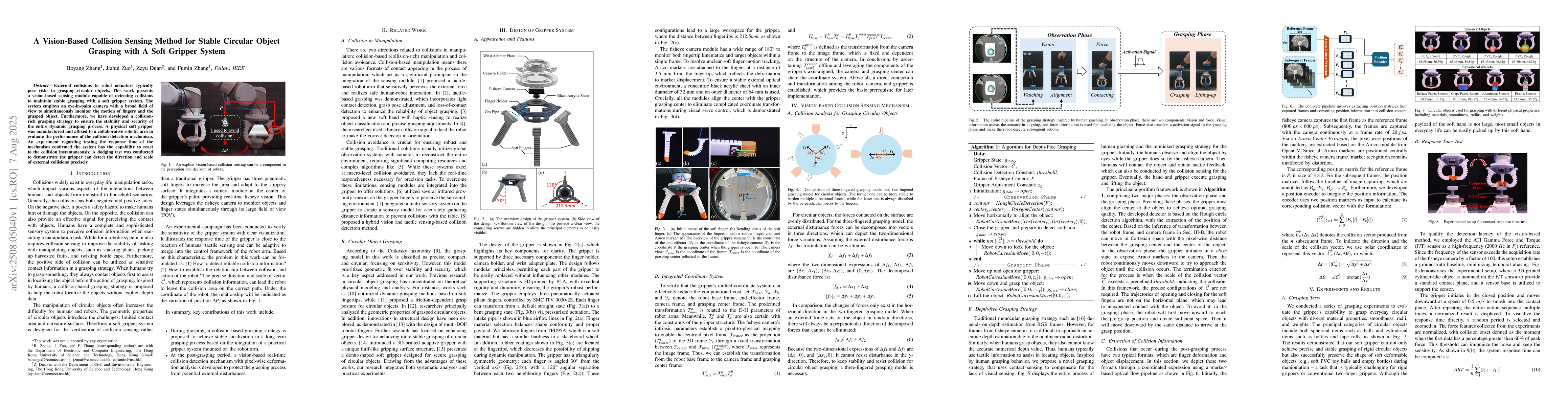 External collisions to robot actuators typically pose risks to grasping circular objects. This work presents a vision-based sensing module capable of detecting collisions to maintain stable grasping with a soft gripper system. The system employs an eye-in-palm camera with a broad field of view to simultaneously monitor the motion of fingers and the grasped object. Furthermore, we have developed a collision-rich grasping strategy to ensure the stability and security of the entire dynamic grasping process. A physical soft gripper was manufactured and affixed to a collaborative robotic arm to evaluate the performance of the collision detection mechanism. An experiment regarding testing the response time of the mechanism confirmed the system has the capability to react to the collision instantaneously. A dodging test was conducted to demonstrate the gripper can detect the direction and scale of external collisions precisely.