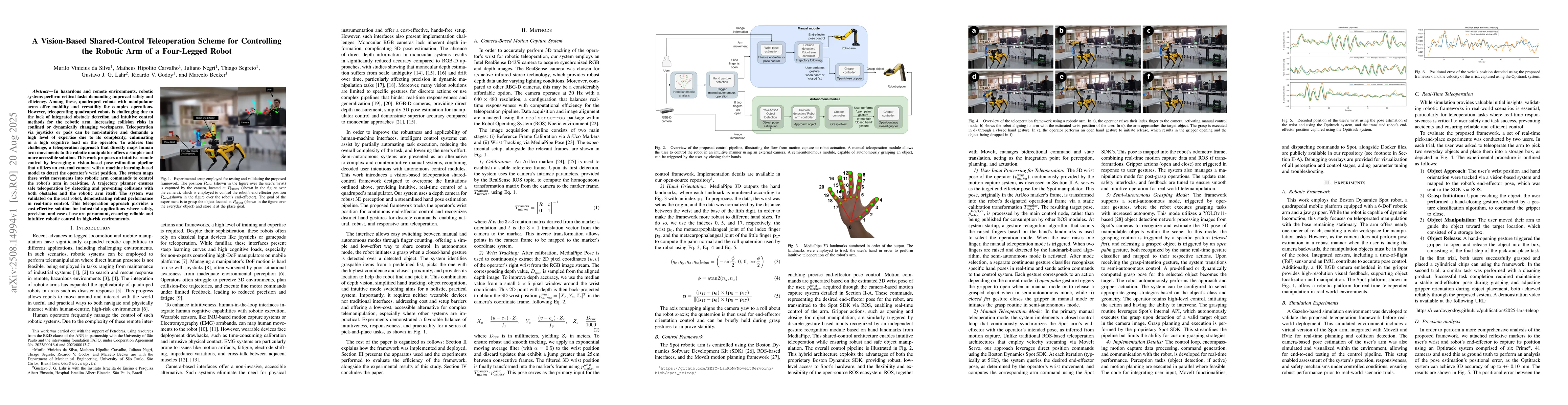 In hazardous and remote environments, robotic systems perform critical tasks demanding improved safety and efficiency. Among these, quadruped robots with manipulator arms offer mobility and versatility for complex operations. However, teleoperating quadruped robots is challenging due to the lack of integrated obstacle detection and intuitive control methods for the robotic arm, increasing collision risks in confined or dynamically changing workspaces. Teleoperation via joysticks or pads can be non-intuitive and demands a high level of expertise due to its complexity, culminating in a high cognitive load on the operator. To address this challenge, a teleoperation approach that directly maps human arm movements to the robotic manipulator offers a simpler and more accessible solution. This work proposes an intuitive remote control by leveraging a vision-based pose estimation pipeline that utilizes an external camera with a machine learning-based model to detect the operator's wrist position. The system maps these wrist movements into robotic arm commands to control the robot's arm in real-time. A trajectory planner ensures safe teleoperation by detecting and preventing collisions with both obstacles and the robotic arm itself. The system was validated on the real robot, demonstrating robust performance in real-time control. This teleoperation approach provides a cost-effective solution for industrial applications where safety, precision, and ease of use are paramount, ensuring reliable and intuitive robotic control in high-risk environments.
