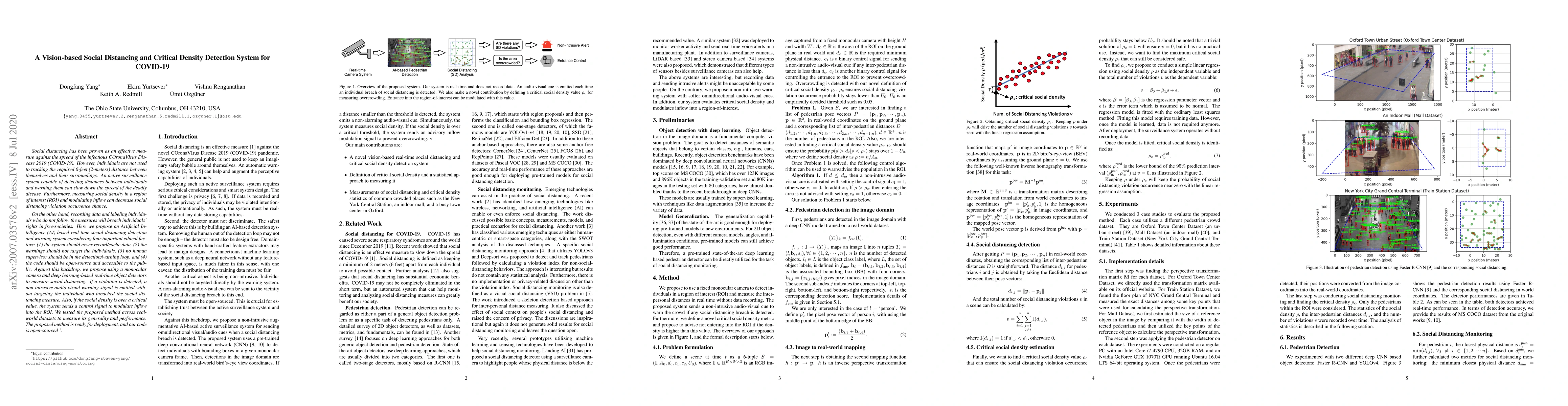 Social distancing has been proven as an effective measure against the spread of the infectious COronaVIrus Disease 2019 (COVID-19). However, individuals are not used to tracking the required 6-feet (2-meters) distance between themselves and their surroundings. An active surveillance system capable of detecting distances between individuals and warning them can slow down the spread of the deadly disease. Furthermore, measuring social density in a region of interest (ROI) and modulating inflow can decrease social distancing violation occurrence chance. On the other hand, recording data and labeling individuals who do not follow the measures will breach individuals' rights in free-societies. Here we propose an Artificial Intelligence (AI) based real-time social distancing detection and warning system considering four important ethical factors: (1) the system should never record/cache data, (2) the warnings should not target the individuals, (3) no human supervisor should be in the detection/warning loop, and (4) the code should be open-source and accessible to the public. Against this backdrop, we propose using a monocular camera and deep learning-based real-time object detectors to measure social distancing. If a violation is detected, a non-intrusive audio-visual warning signal is emitted without targeting the individual who breached the social distancing measure. Also, if the social density is over a critical value, the system sends a control signal to modulate inflow into the ROI. We tested the proposed method across real-world datasets to measure its generality and performance. The proposed method is ready for deployment, and our code is open-sourced.