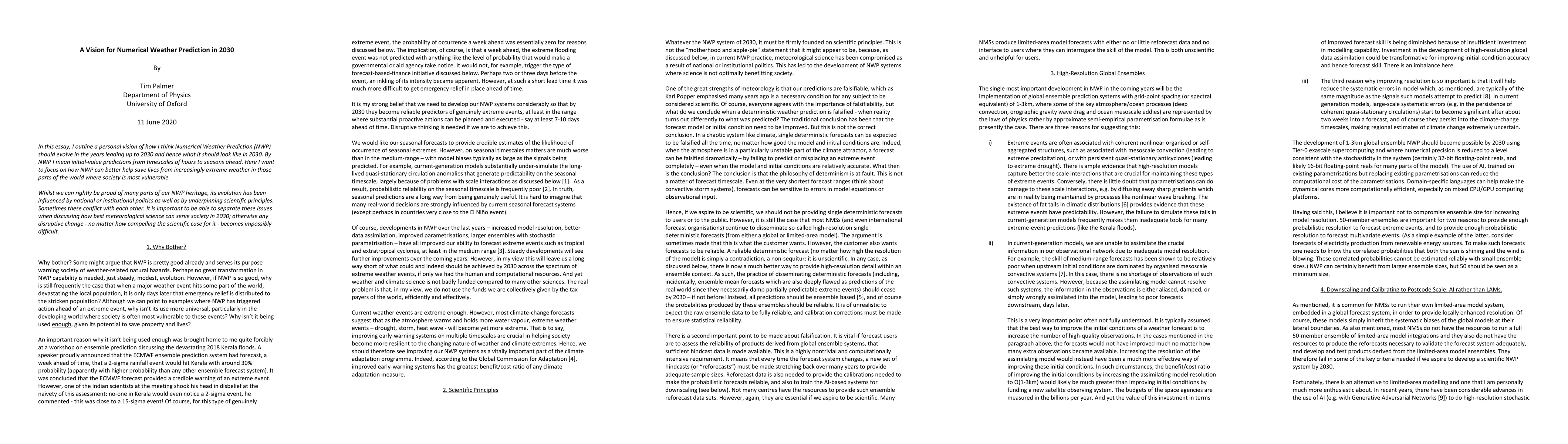 In this essay, I outline a personal vision of how I think Numerical Weather Prediction (NWP) should evolve in the years leading up to 2030 and hence what it should look like in 2030. By NWP I mean initial-value predictions from timescales of hours to seasons ahead. Here I want to focus on how NWP can better help save lives from increasingly extreme weather in those parts of the world where society is most vulnerable. Whilst we can rightly be proud of many parts of our NWP heritage, its evolution has been influenced by national or institutional politics as well as by underpinning scientific principles. Sometimes these conflict with each other. It is important to be able to separate these issues when discussing how best meteorological science can serve society in 2030; otherwise any disruptive change - no matter how compelling the scientific case for it - becomes impossibly difficult.