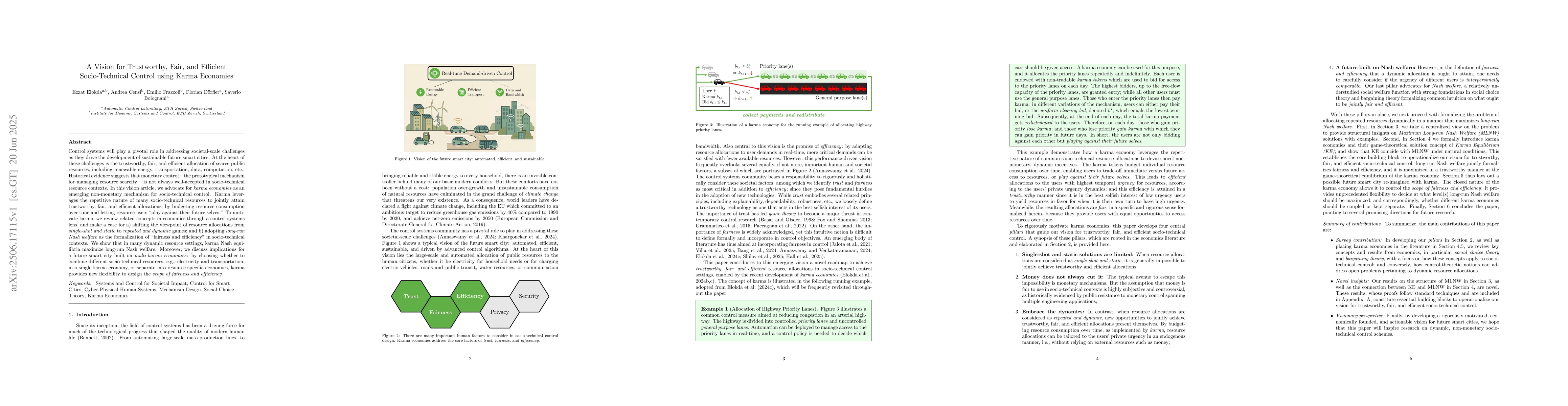Control systems will play a pivotal role in addressing societal-scale challenges as they drive the development of sustainable future smart cities. At the heart of these challenges is the trustworthy, fair, and efficient allocation of scarce public resources, including renewable energy, transportation, data, computation, etc.. Historical evidence suggests that monetary control -- the prototypical mechanism for managing resource scarcity -- is not always well-accepted in socio-technical resource contexts. In this vision article, we advocate for karma economies as an emerging non-monetary mechanism for socio-technical control. Karma leverages the repetitive nature of many socio-technical resources to jointly attain trustworthy, fair, and efficient allocations; by budgeting resource consumption over time and letting resource users ``play against their future selves.'' To motivate karma, we review related concepts in economics through a control systems lens, and make a case for a) shifting the viewpoint of resource allocations from single-shot and static to repeated and dynamic games; and b) adopting long-run Nash welfare as the formalization of ``fairness and efficiency'' in socio-technical contexts. We show that in many dynamic resource settings, karma Nash equilibria maximize long-run Nash welfare. Moreover, we discuss implications for a future smart city built on multi-karma economies: by choosing whether to combine different socio-technical resources, e.g., electricity and transportation, in a single karma economy, or separate into resource-specific economies, karma provides new flexibility to design the scope of fairness and efficiency.