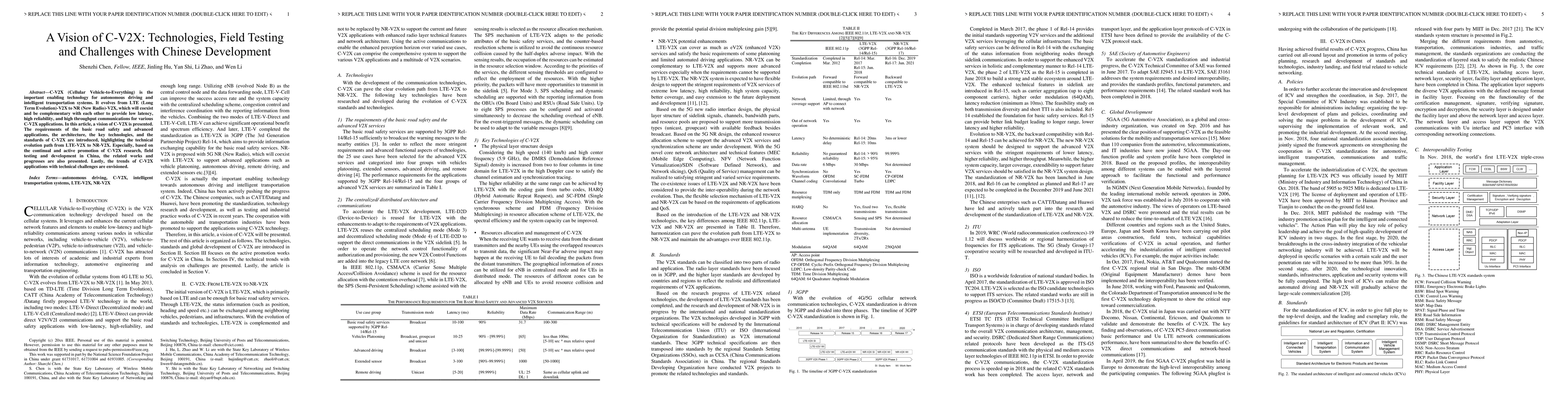 A vision for C-V2X technology is presented, highlighting its evolution from LTE to NR, key technologies, and applications in China. The paper explores the potential of C-V2X for autonomous driving and intelligent transportation systems with a focus on technical challenges and future trends.