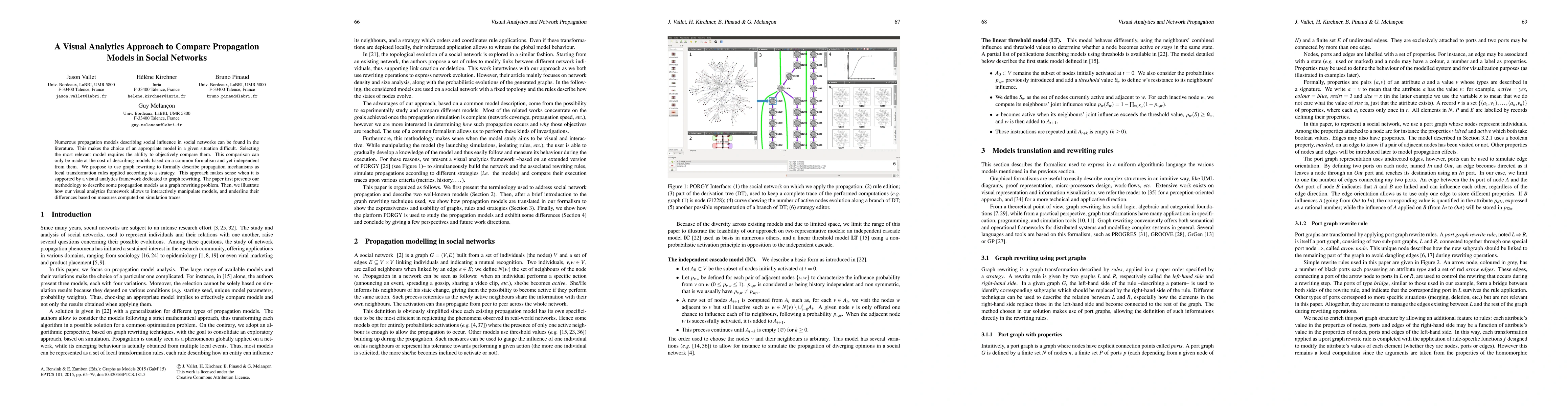 This paper proposes a visual analytics approach to compare various propagation models in social networks, using graph rewriting to formally describe these models. The methodology is supported by a visual analytics framework that allows for interactive manipulation and comparison of the models based on simulation trace metrics.