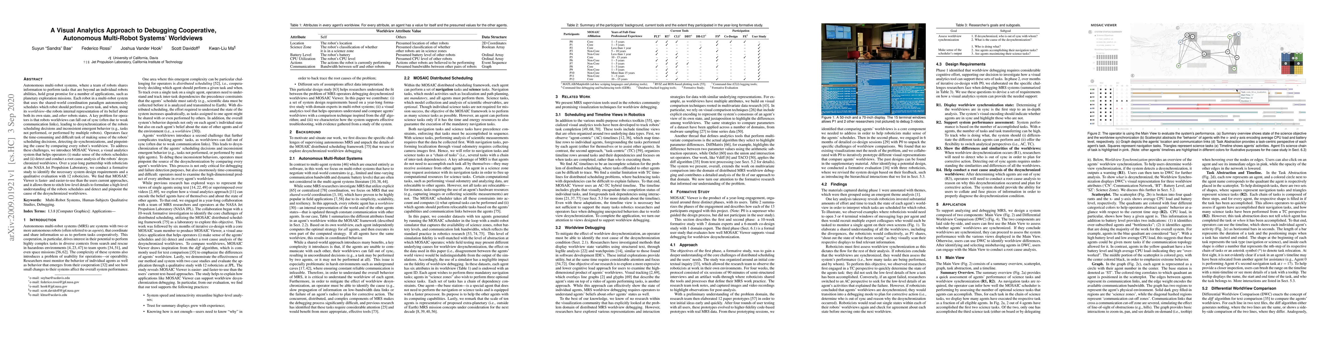 Autonomous multi-robot systems, where a team of robots shares information to perform tasks that are beyond an individual robot's abilities, hold great promise for a number of applications, such as planetary exploration missions. Each robot in a multi-robot system that uses the shared-world coordination paradigm autonomously schedules which robot should perform a given task, and when, using its worldview--the robot's internal representation of its belief about both its own state, and other robots' states. A key problem for operators is that robots' worldviews can fall out of sync (often due to weak communication links), leading to desynchronization of the robots' scheduling decisions and inconsistent emergent behavior (e.g., tasks not performed, or performed by multiple robots). Operators face the time-consuming and difficult task of making sense of the robots' scheduling decisions, detecting de-synchronizations, and pinpointing the cause by comparing every robot's worldview. To address these challenges, we introduce MOSAIC Viewer, a visual analytics system that helps operators (i) make sense of the robots' schedules and (ii) detect and conduct a root cause analysis of the robots' desynchronized worldviews. Over a year-long partnership with roboticists at the NASA Jet Propulsion Laboratory, we conduct a formative study to identify the necessary system design requirements and a qualitative evaluation with 12 roboticists. We find that MOSAIC Viewer is faster- and easier-to-use than the users' current approaches, and it allows them to stitch low-level details to formulate a high-level understanding of the robots' schedules and detect and pinpoint the cause of the desynchronized worldviews.