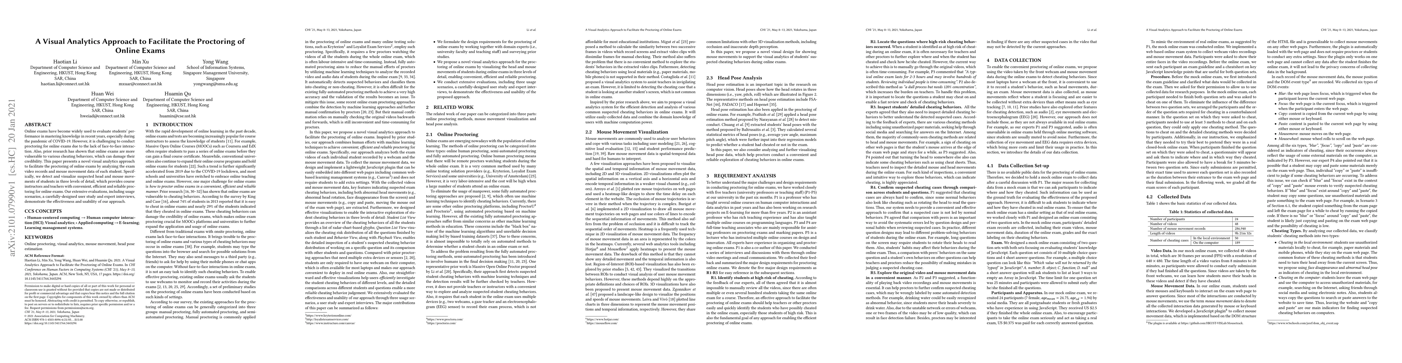 This paper introduces a visual analytics method to enhance the proctoring of online exams by analyzing student video and mouse movement data, aiming to detect and visualize suspicious behaviors. The approach's effectiveness and usability are validated through extensive evaluations including user studies and expert feedback.