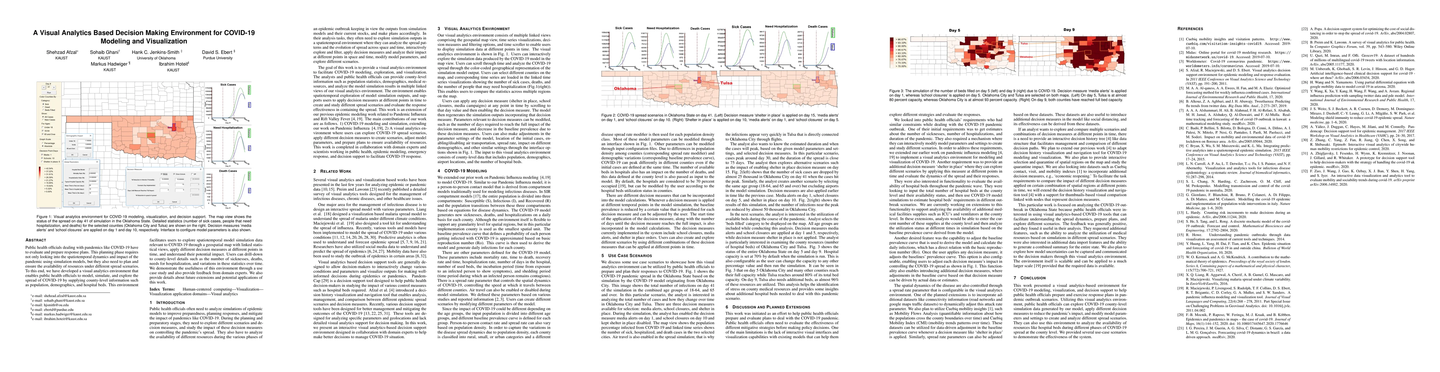 Public health officials dealing with pandemics like COVID-19 have to evaluate and prepare response plans. This planning phase requires not only looking into the spatiotemporal dynamics and impact of the pandemic using simulation models, but they also need to plan and ensure the availability of resources under different spread scenarios. To this end, we have developed a visual analytics environment that enables public health officials to model, simulate, and explore the spread of COVID-19 by supplying county-level information such as population, demographics, and hospital beds. This environment facilitates users to explore spatiotemporal model simulation data relevant to COVID-19 through a geospatial map with linked statistical views, apply different decision measures at different points in time, and understand their potential impact. Users can drill-down to county-level details such as the number of sicknesses, deaths, needs for hospitalization, and variations in these statistics over time. We demonstrate the usefulness of this environment through a use case study and also provide feedback from domain experts. We also provide details about future extensions and potential applications of this work.