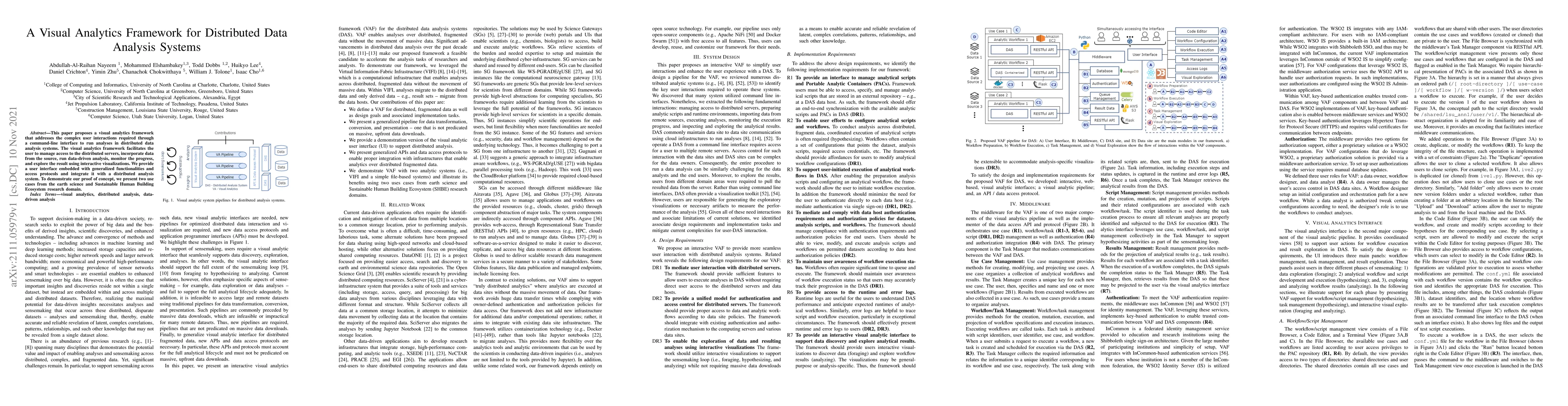 This paper introduces a visual analytics framework to simplify complex interactions in distributed data analysis systems, enabling users to manage data access, run analyses, monitor progress, and explore results via interactive visualizations. The framework is demonstrated through two use cases in earth science and sustainable building research.