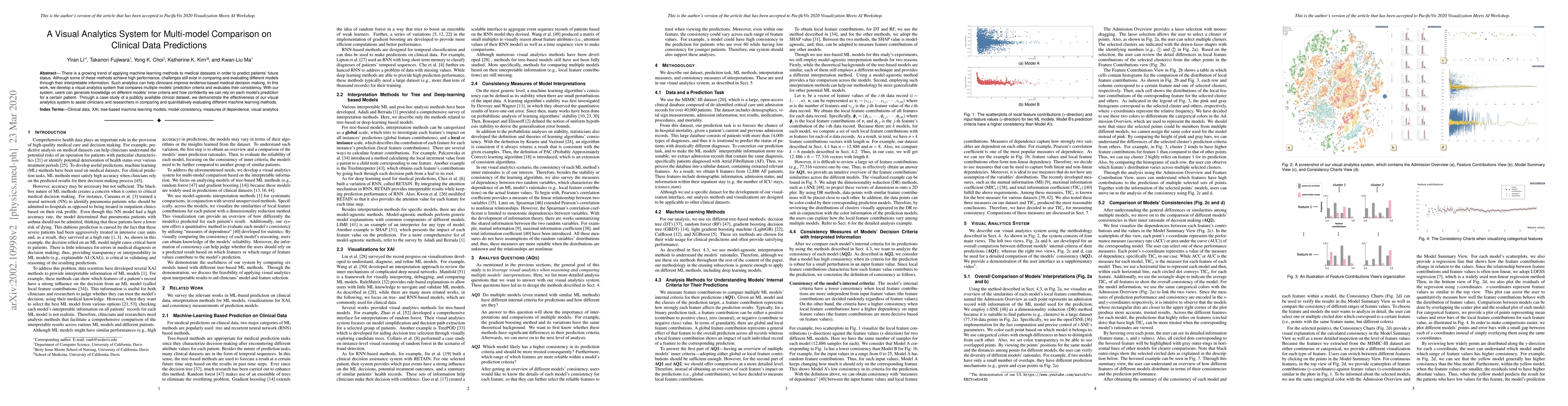 There is a growing trend of applying machine learning methods to medical datasets in order to predict patients' future status. Although some of these methods achieve high performance, challenges still exist in comparing and evaluating different models through their interpretable information. Such analytics can help clinicians improve evidence-based medical decision making. In this work, we develop a visual analytics system that compares multiple models' prediction criteria and evaluates their consistency. With our system, users can generate knowledge on different models' inner criteria and how confidently we can rely on each model's prediction for a certain patient. Through a case study of a publicly available clinical dataset, we demonstrate the effectiveness of our visual analytics system to assist clinicians and researchers in comparing and quantitatively evaluating different machine learning methods.