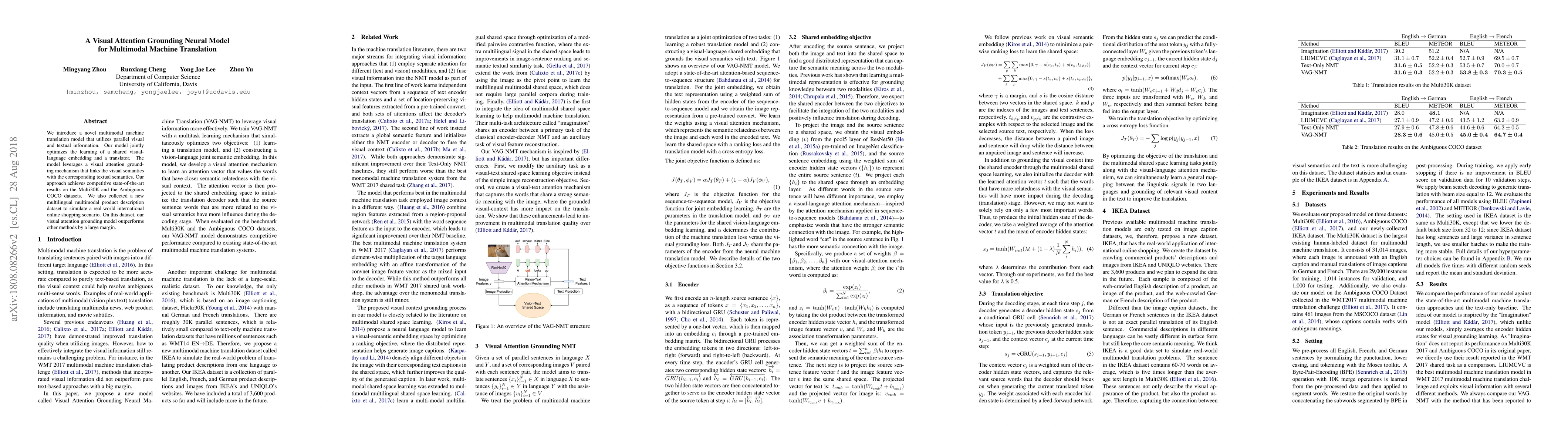 This paper proposes a novel multimodal machine translation model that integrates visual and textual information through a shared visual-language embedding and a translator, enhanced by a visual attention grounding mechanism. The model achieves state-of-the-art results on Multi30K and Ambiguous COCO datasets and significantly outperforms other methods on a newly collected multilingual product description dataset.