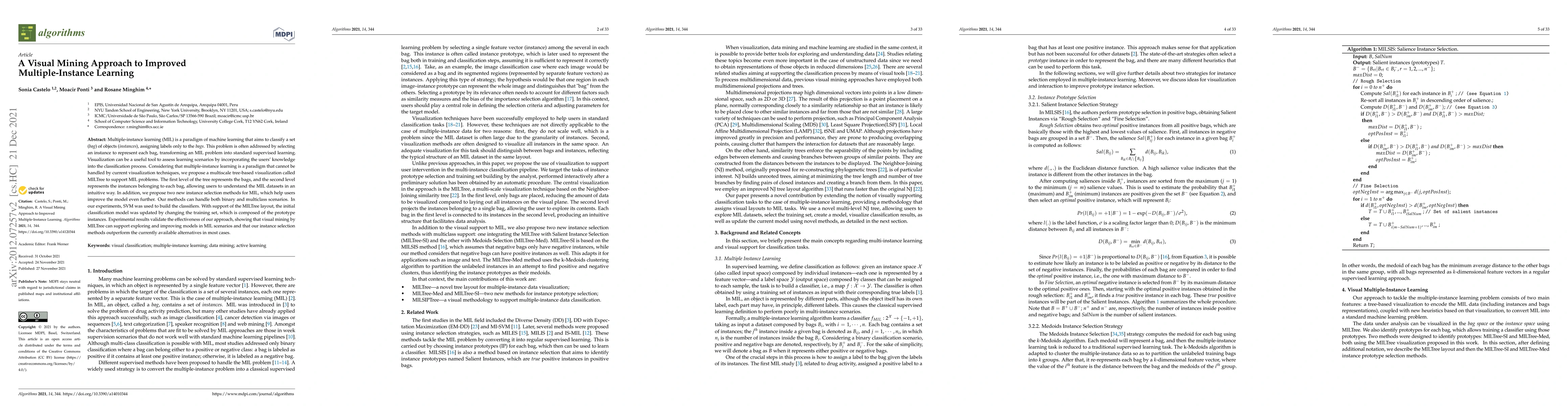 Multiple-instance learning (MIL) is a paradigm of machine learning that aims to classify a set (bag) of objects (instances), assigning labels only to the bags. This problem is often addressed by selecting an instance to represent each bag, transforming a MIL problem into standard supervised learning. Visualization can be a useful tool to assess learning scenarios by incorporating the users' knowledge into the classification process. Considering that multiple-instance learning is a paradigm that cannot be handled by current visualization techniques, we propose a multiscale tree-based visualization called MILTree to support MIL problems. The first level of the tree represents the bags, and the second level represents the instances belonging to each bag, allowing users to understand the MIL datasets in an intuitive way. In addition, we propose two new instance selection methods for MIL, which help users improve the model even further. Our methods can handle both binary and multiclass scenarios. In our experiments, SVM was used to build the classifiers. With support of the MILTree layout, the initial classification model was updated by changing the training set, which is composed of the prototype instances. Experimental results validate the effectiveness of our approach, showing that visual mining by MILTree can support exploring and improving models in MIL scenarios and that our instance selection methods outperform the currently available alternatives in most cases.